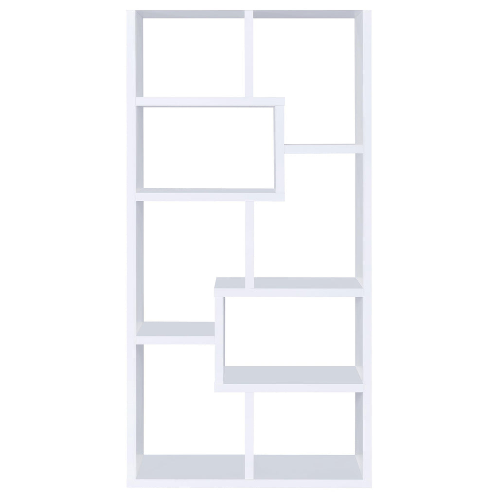 Kick your home decor up a notch. This striking bookcase has a bold, geometric design that adds an artistic accent to any room. With seven convenient shelves, it offers convenient storage for anything from books to memorabilia to trophies and more. Crafted from MDF, particle board, and engineered veneer, it's as sturdy as it is stylish. Available in four stunning shades, there's an option to match the color palette of any home.