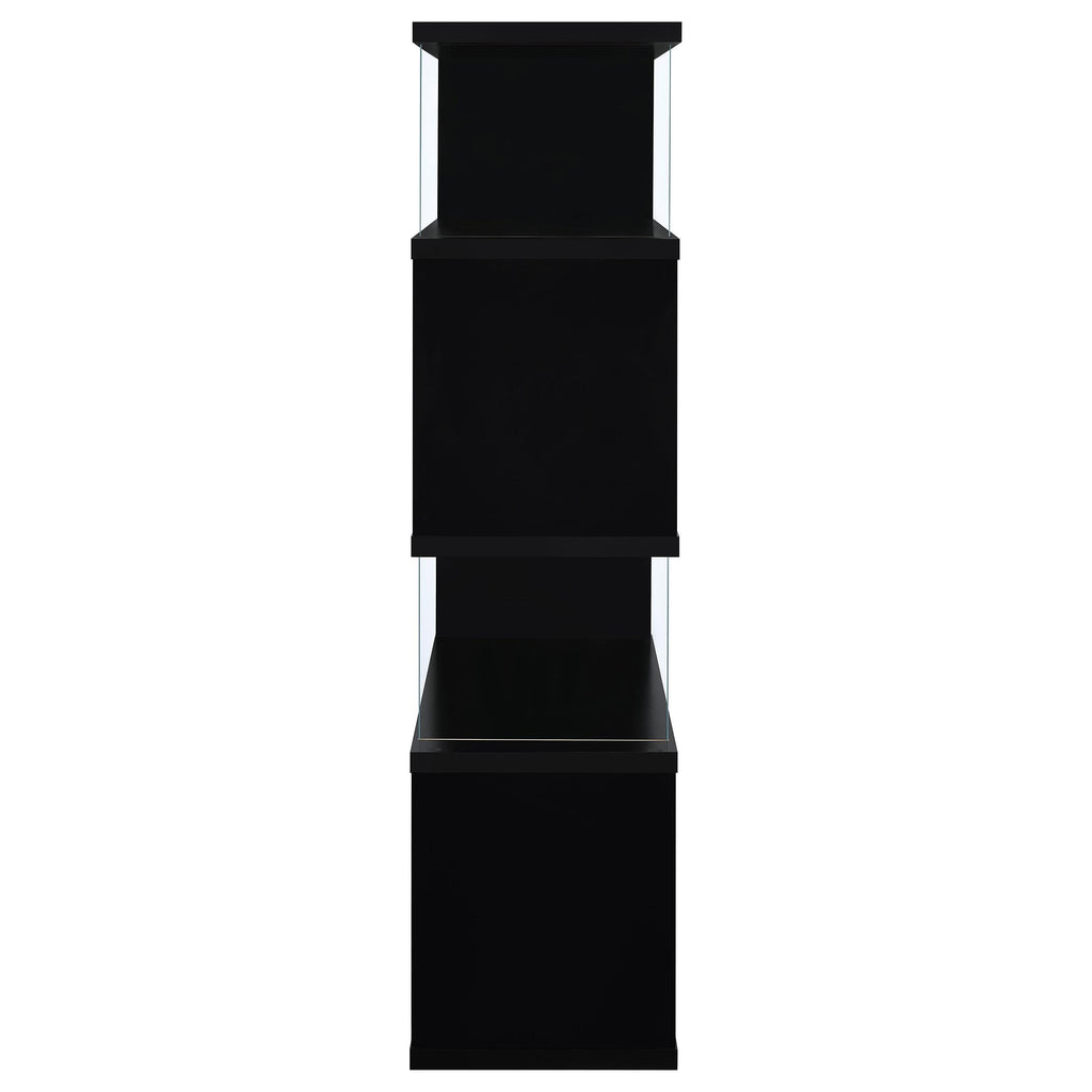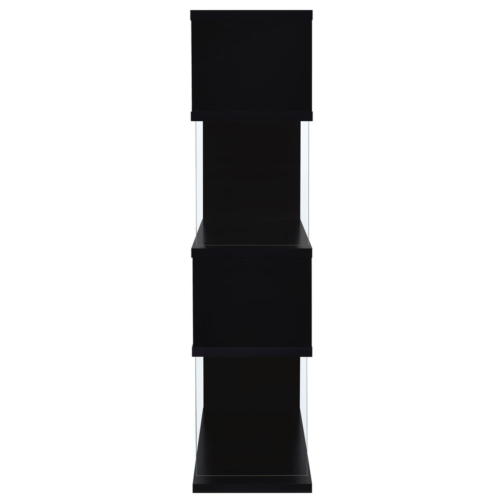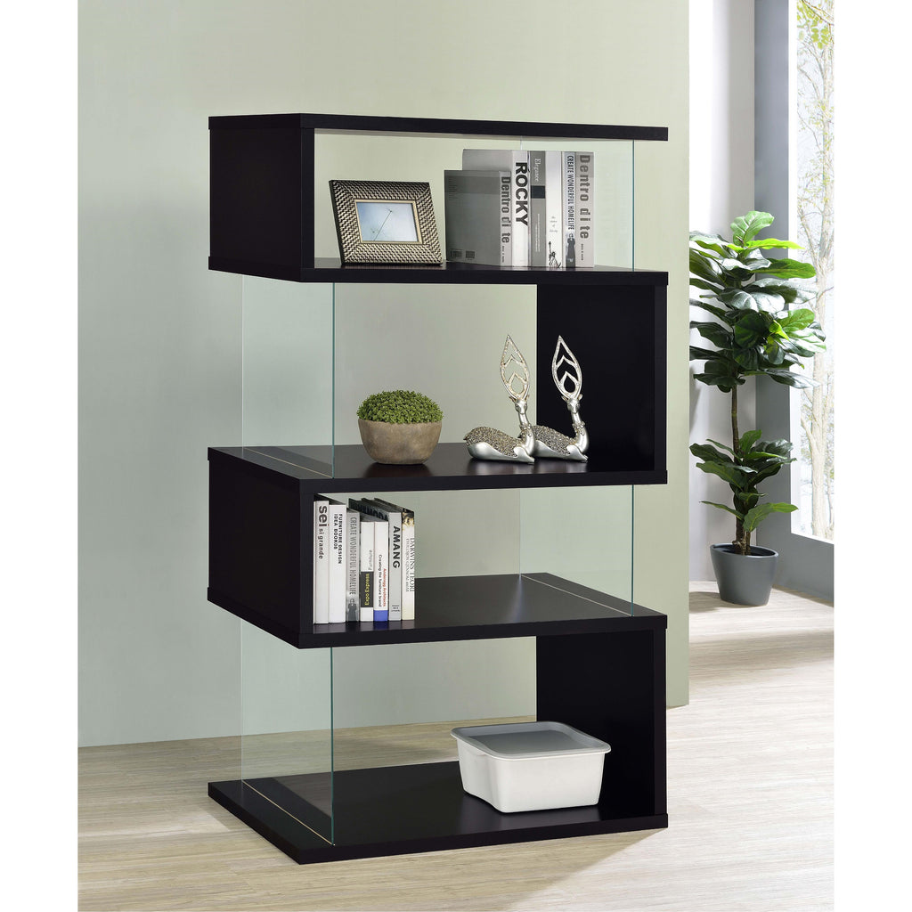 With a striking, zig-zag design, this bookcase exudes contemporary charm. Though they appear to be open, its sides are enhanced by tempered glass panels to help keep books and belongings in one place. With four convenient tiers, it provides ample space for storage. Made with MDF and engineered veneer, this bookcase offers quality and durability. It's available in four finishes, giving you attractive options to match your home decor.