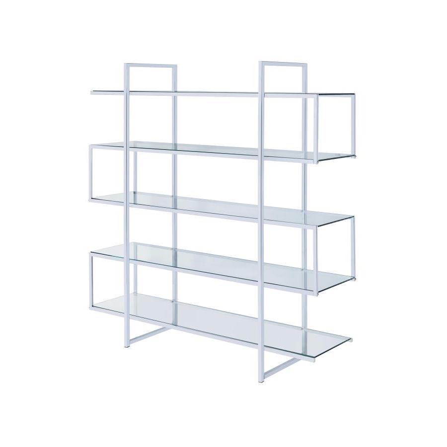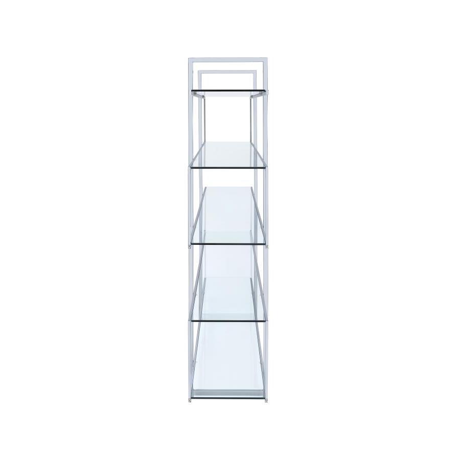 Jump on a trendy, modern bandwagon. Refresh a contemporary space with a stylish piece designed to organize and display. This four-tier bookcase offers a cool profile with personality. Tempered glass shelves blend perfectly with a steel frame. Make room for books, photos, and decor on this edgy, attitude-rich piece.