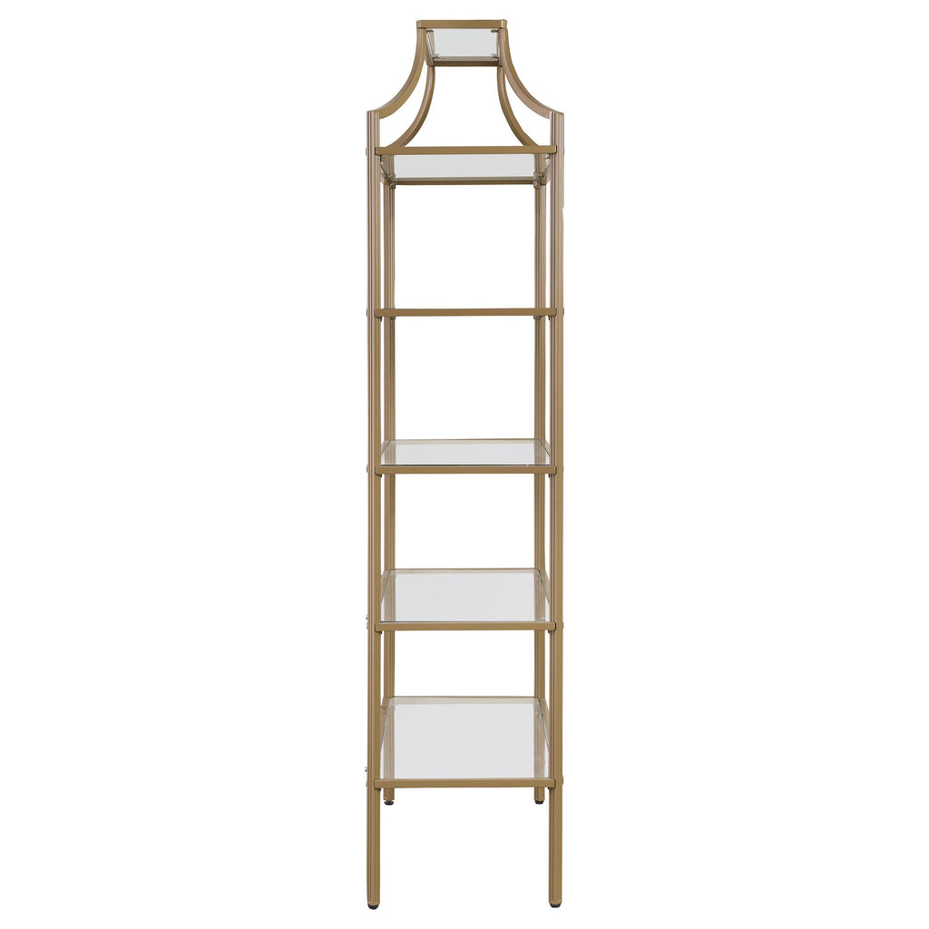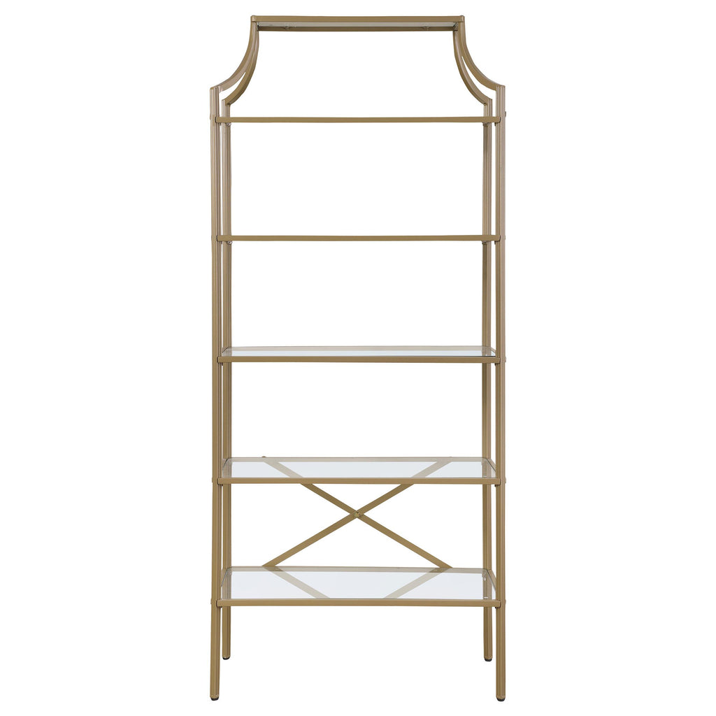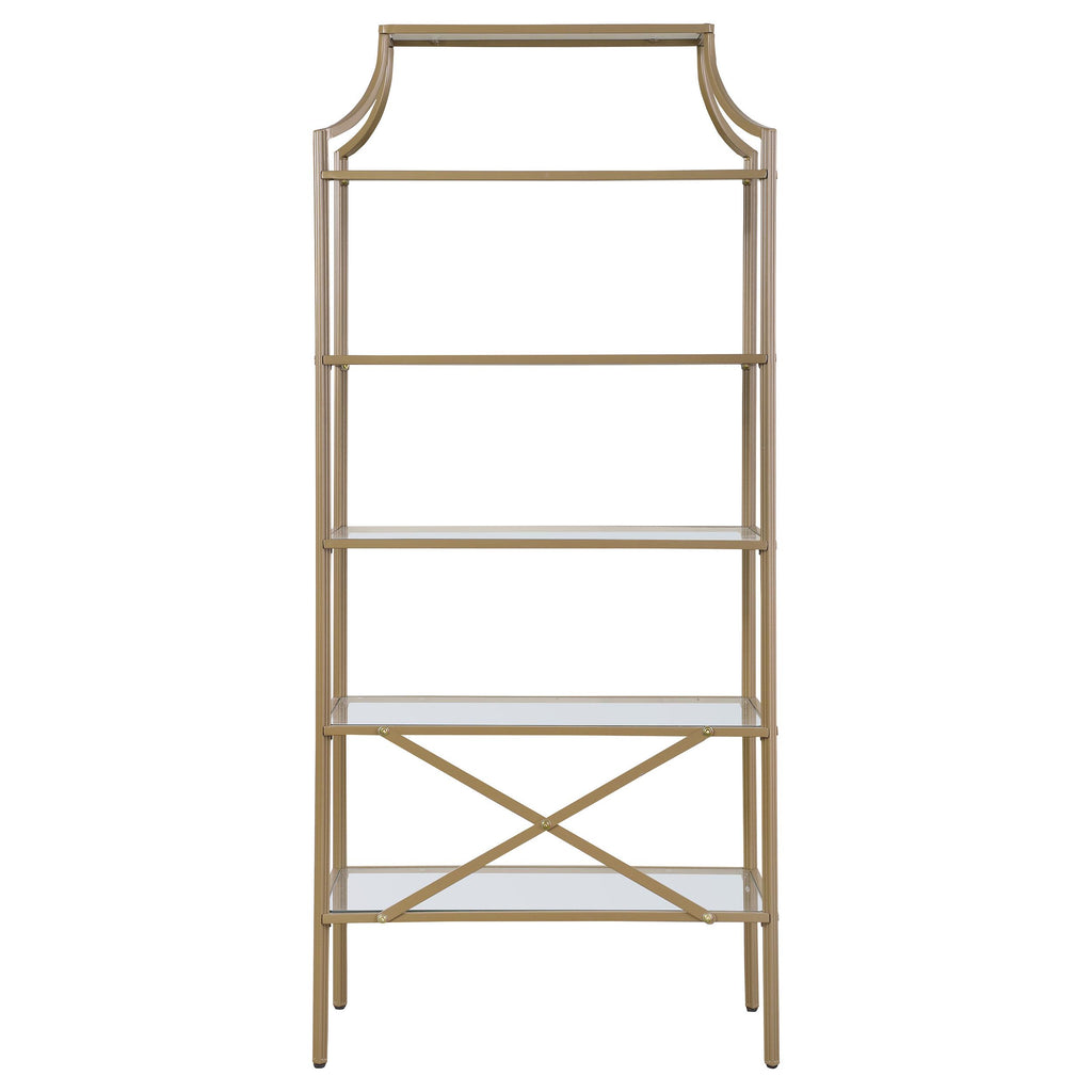 A call for strength and style gets answered by this bookcase. Contemporary style allows for easy placement within your space. The stylish metal frame in gold creates conversation. Enjoy durability as all glass elements are tempered. Updated unit boasts five (5) open shelves for use as storage or display.