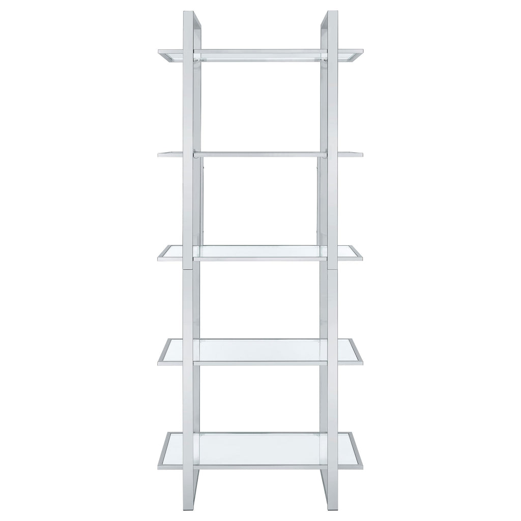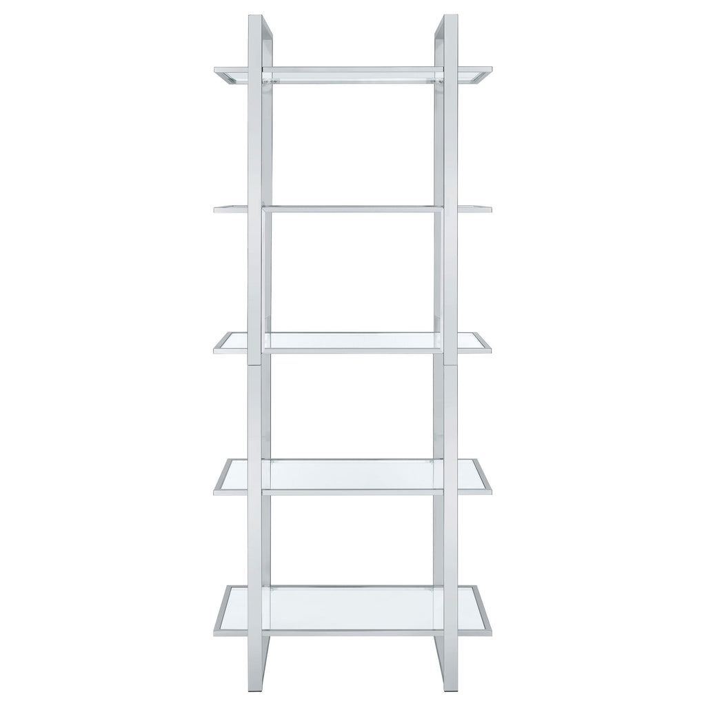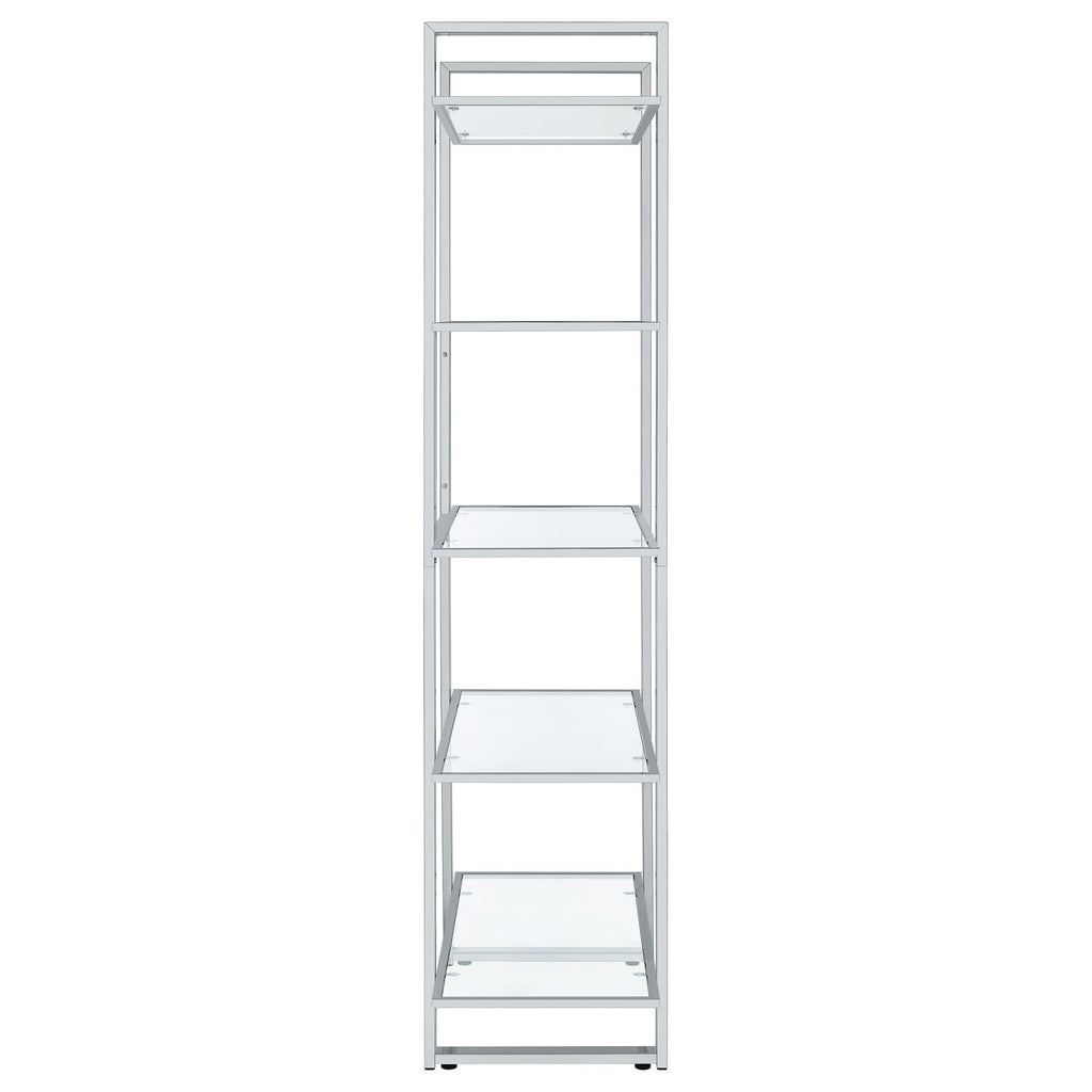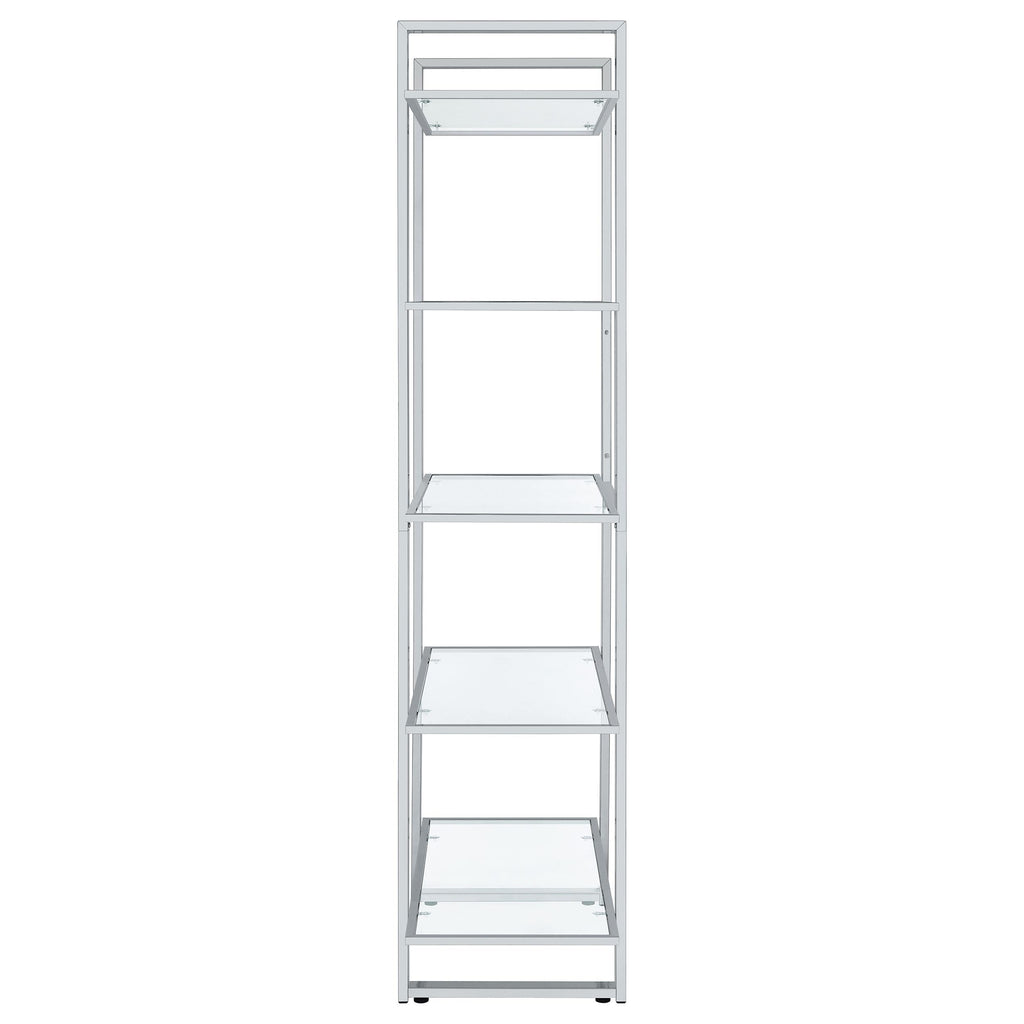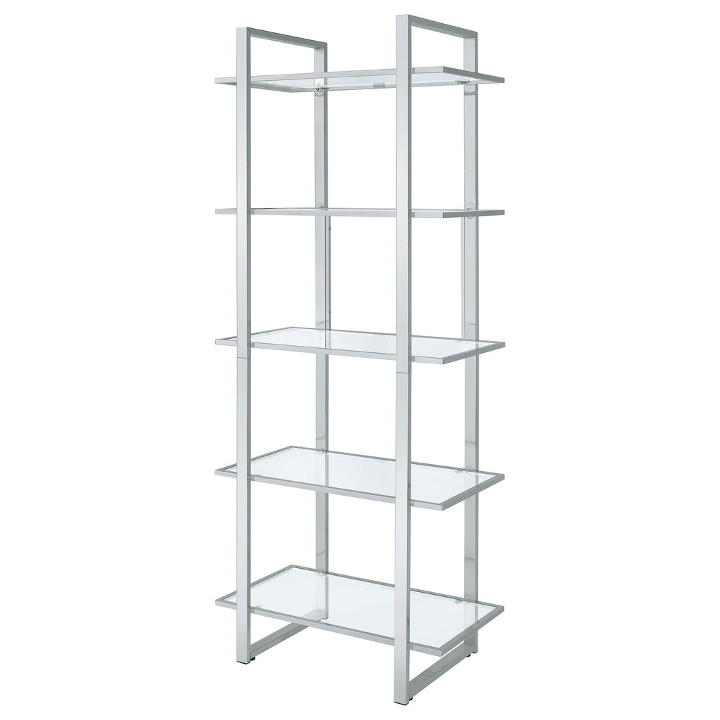 Create a well styled living space that radiates modern luxury. This contemporary bookcase delivers sleek lines of metal in your choice of gorgeous, polished finishes. The shelves are made with tempered glass for smooth, sturdy support. With five shelves total, it offers ample space to display photos, keepsakes, and more. Perfect for a living room, home office, or den, this fresh, modern bookcase is a fabulous choice for any home.