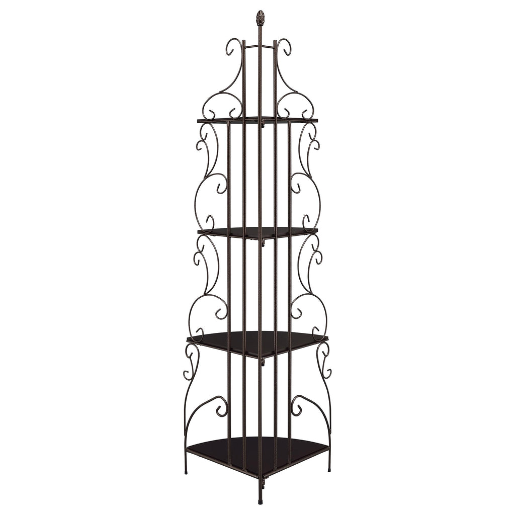 Ratchet up the romance in a traditional space. Designed to bolster the traditional look of a central living space, this corner bookcase is a great choice. Four graduated tiers create a subtle silhouette and offer plenty of space to display books, decor, and potted plants. Made from steel and wood-like material, it blends an earthy elegance with old fashioned charm. Warm any space with its luscious cappuccino and copper finish.