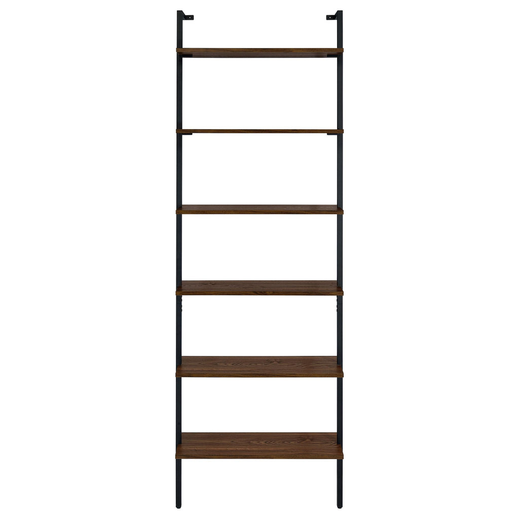 Curate your space to achieve a refined look and feel with this modern wall bookcase. Its elegant simplicity of silhouette brings light, airy ambiance in any space, maximizing space utilization without overwhelming. It features six open shelves in a walnut finish, each set within a black finish metal frame. The clean, chic lines of the frame attach to the wall at the top and drop to the floor, creating stability and minimalist appeal. Add a pair flanking your television for storage, or create a decorative vignette in a living or dining room.