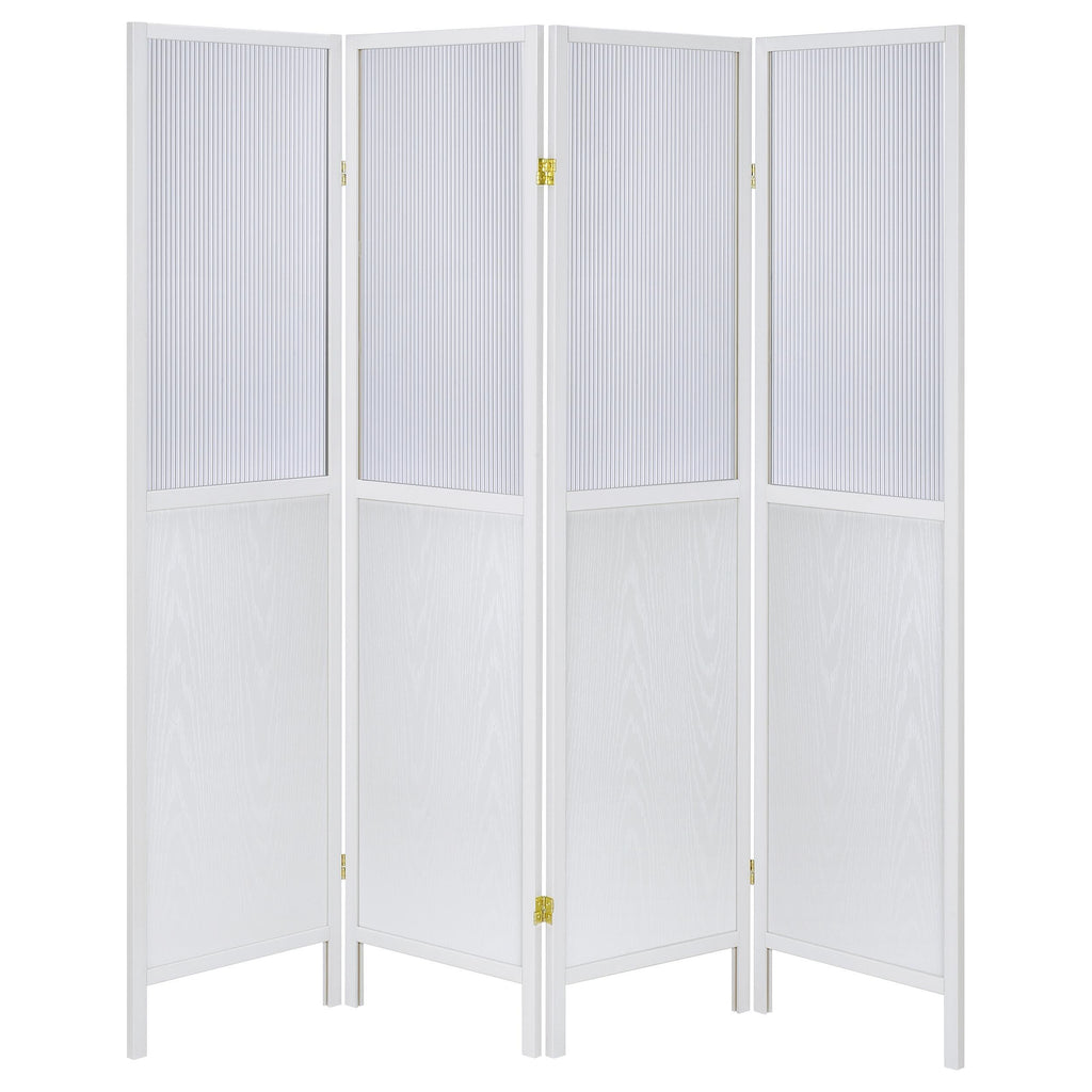 Create the perfect sense of division in your open living space with a transitional four-panel room divider. The freestanding piece offers four tall panels, each divided with a semi-opaque top section that allows light to pass through. The panels are ideal for a large primary suite, creating a sense of privacy for dressing or to section off a desk. The frame of each panel features a neutral finish and a solid lower panel for excellent performance and privacy. The lower panels includes a wood grain finish that's subtle, offering a touch of dimension to any room.