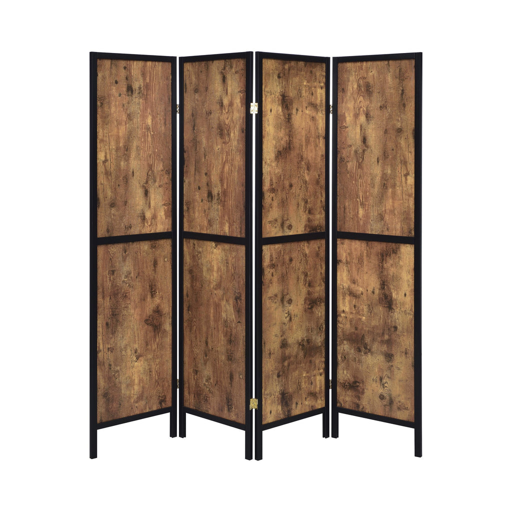 Separate a classic space with this warm four-panel screen. Sleek and clean, the legs feature a dark finish that adds structure to the divider. In an antique nutmeg finish, the panels showcase an exposed wood grain that adds depth to any shared bed or living room. Warm and rich, this screen combines rustic charm with smooth modern details. Bright metallic hardware connects the panels, allowing for versatility in position.