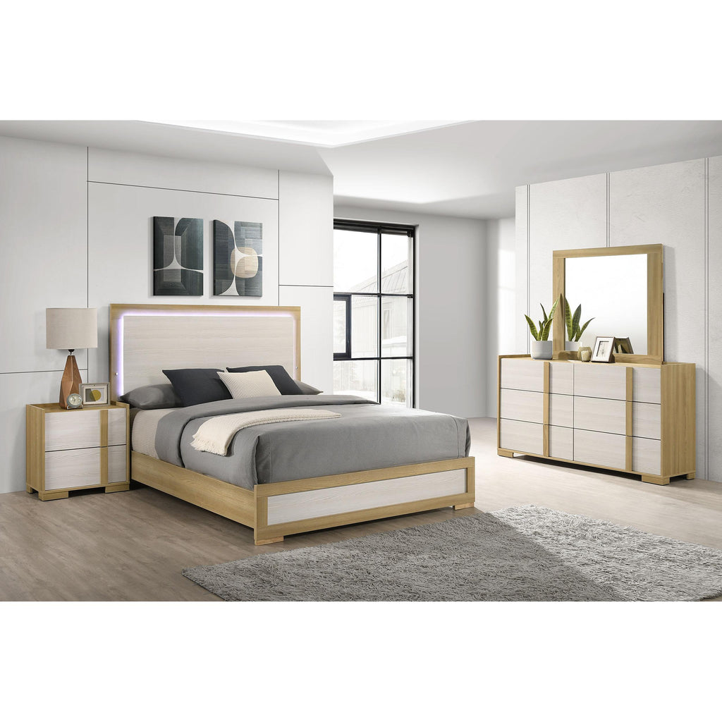 Transform your bedroom into a haven of modern elegance with this exquisite bedroom set. Inspired by contemporary Italian design, each piece in this collection features a sophisticated blend of natural wood tones and crisp white panels, crafted from durable, easy-care melamine. Whichever configuration you choose, this set offers a harmonious blend of style and functionality. The bed, available in both queen and eastern king sizes, is complemented by a matching nightstand, dresser, dresser mirror, and optional chest. Elevate your home decor with this cohesive and stylish set, designed to bring both beauty and practicality to your space.