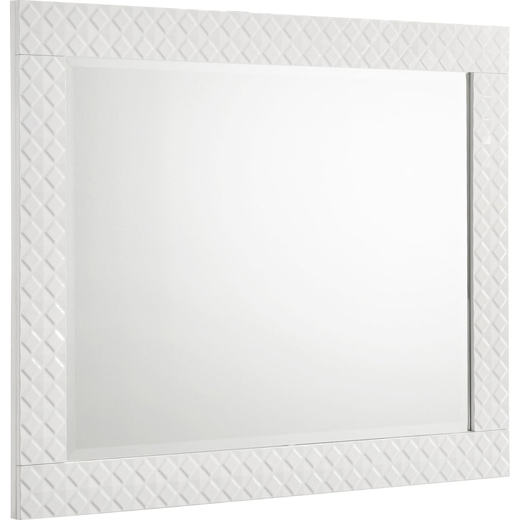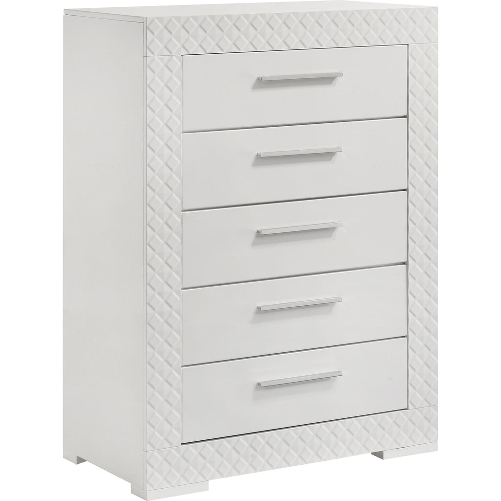 Upgrade your bedroom with this luxurious five-piece set, featuring a bed, nightstand, dresser, mirror, and chest. The set showcases a high gloss finish and 3-dimensional diamond tile emboss, offering a contemporary Italian aesthetic. Each piece is designed for both style and practicality, with ample storage options and thoughtful details like felt-lined top drawers. The bed includes a touch LED light in the headboard, enhancing the ambiance of your space. This set is ideal for those who desire a sophisticated and cohesive bedroom design.