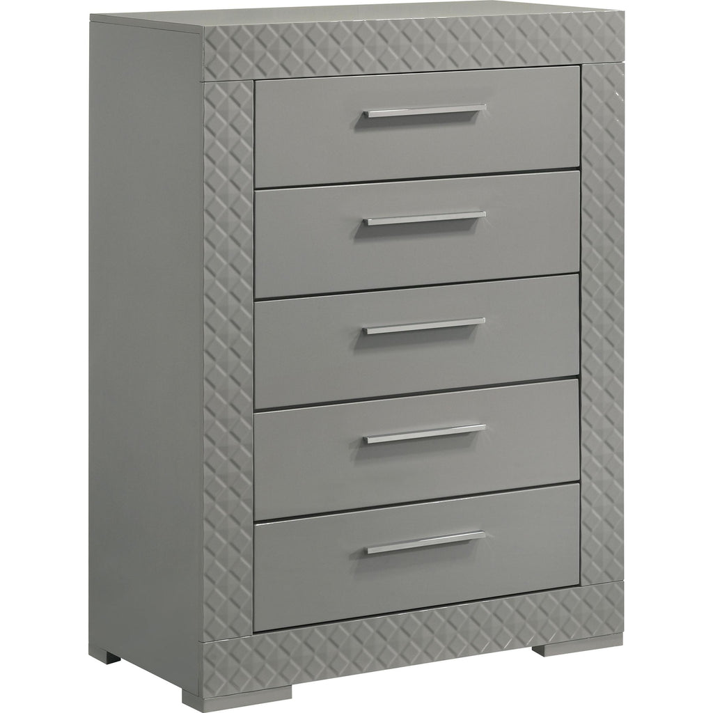 Upgrade your bedroom with this luxurious five-piece set, featuring a bed, nightstand, dresser, mirror, and chest. The set showcases a high gloss finish and 3-dimensional diamond tile emboss, offering a contemporary Italian aesthetic. Each piece is designed for both style and practicality, with ample storage options and thoughtful details like felt-lined top drawers. The bed includes a touch LED light in the headboard, enhancing the ambiance of your space. This set is ideal for those who desire a sophisticated and cohesive bedroom design.