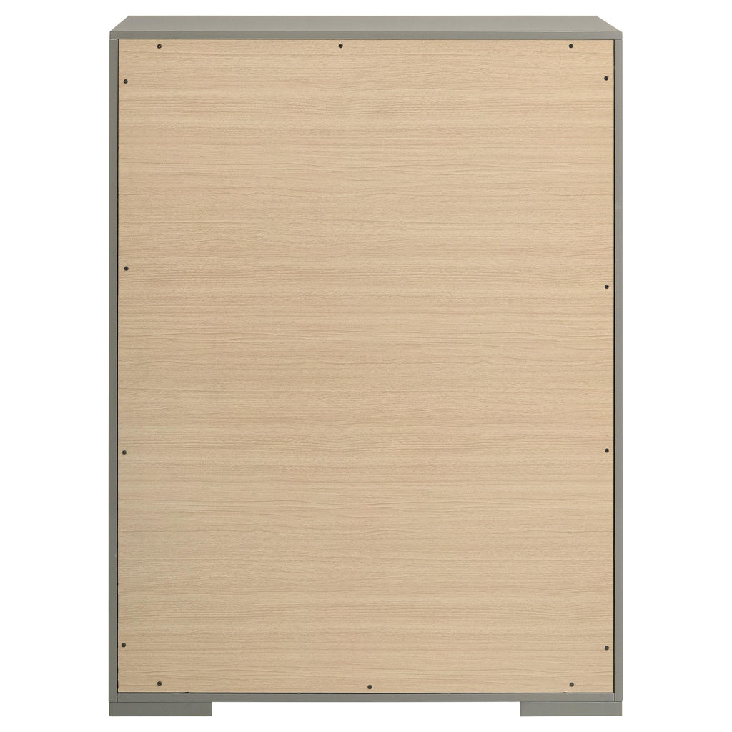 Organize your wardrobe in style with this contemporary chest. The high gloss finish and 3-dimensional diamond tile emboss provide a chic, modern look that enhances any bedroom decor. Five spacious drawers offer ample storage for clothing and linens, each with felt lining in the top drawers to protect your delicate items. The chest is built with robust materials and English dovetail joinery, ensuring durability and smooth functionality. This piece is both practical and stylish, perfect for a modern home.