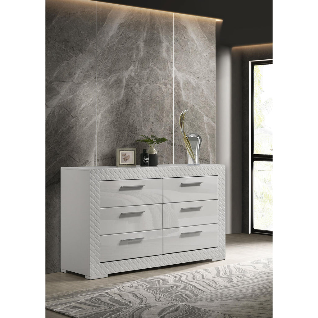 Elevate your bedroom decor with this stunning dresser, designed for both beauty and function. The high gloss finish enhances the contemporary Italian style, while the 3-dimensional diamond tile emboss adds a touch of sophistication. Six spacious drawers offer ample storage for clothing and accessories, each featuring felt lining in the top drawers to protect delicate items. The dresser is built with sturdy English dovetail joinery and 45mm thick metal glides, ensuring smooth operation and durability. This piece is perfect for those who appreciate fine craftsmanship and modern design.