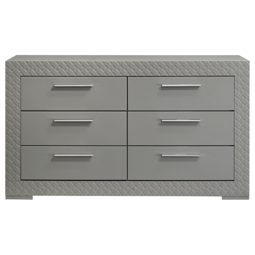 Elevate your bedroom decor with this stunning dresser, designed for both beauty and function. The high gloss finish enhances the contemporary Italian style, while the 3-dimensional diamond tile emboss adds a touch of sophistication. Six spacious drawers offer ample storage for clothing and accessories, each featuring felt lining in the top drawers to protect delicate items. The dresser is built with sturdy English dovetail joinery and 45mm thick metal glides, ensuring smooth operation and durability. This piece is perfect for those who appreciate fine craftsmanship and modern design.