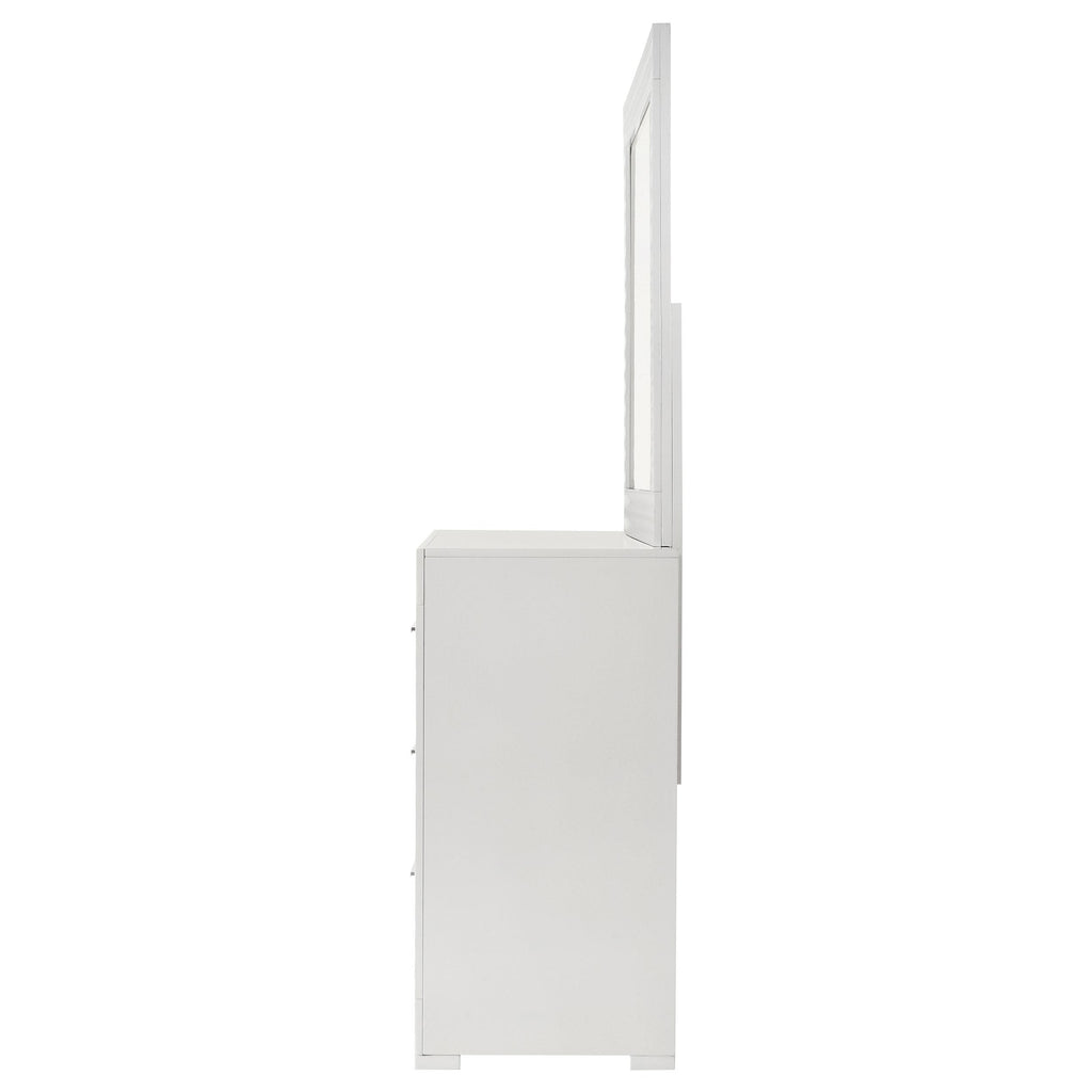 Bring a touch of modern luxury to your bedroom with this dresser and mirror set. Featuring a high gloss finish and 3-dimensional diamond tile emboss, this set exudes contemporary Italian style. The dresser offers ample storage with six spacious drawers, including felt-lined top drawers for delicate items. The matching mirror adds a cohesive element, enhancing the set's sophisticated design. This dresser and mirror set is perfect for those who appreciate refined aesthetics and quality craftsmanship.
