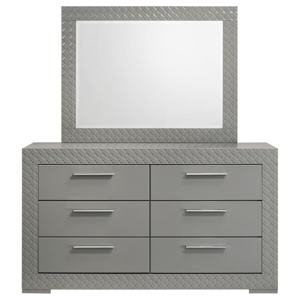 Bring a touch of modern luxury to your bedroom with this dresser and mirror set. Featuring a high gloss finish and 3-dimensional diamond tile emboss, this set exudes contemporary Italian style. The dresser offers ample storage with six spacious drawers, including felt-lined top drawers for delicate items. The matching mirror adds a cohesive element, enhancing the set's sophisticated design. This dresser and mirror set is perfect for those who appreciate refined aesthetics and quality craftsmanship.