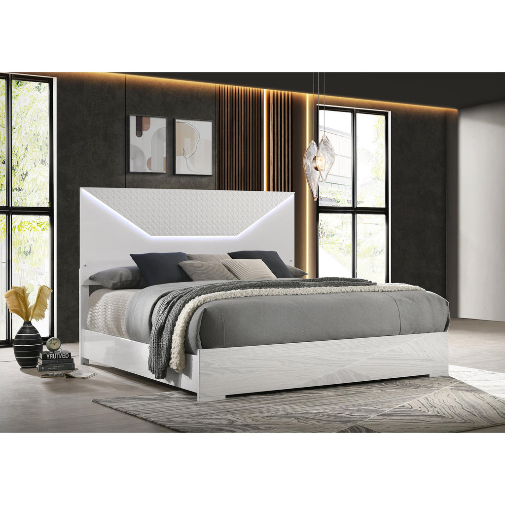 Transform your bedroom with this luxurious bed, featuring a true polyurethane high gloss finish that exudes contemporary Italian elegance. The headboard showcases a stunning 3-dimensional diamond tile emboss, adding texture and a sleek, modern touch. With integrated touch LED lighting, this bed provides a warm, ambient glow, perfect for creating a cozy atmosphere. The low-profile design and meticulous craftsmanship ensure both style and durability. This bed is a statement piece that combines form and function, offering a sophisticated update to any bedroom.