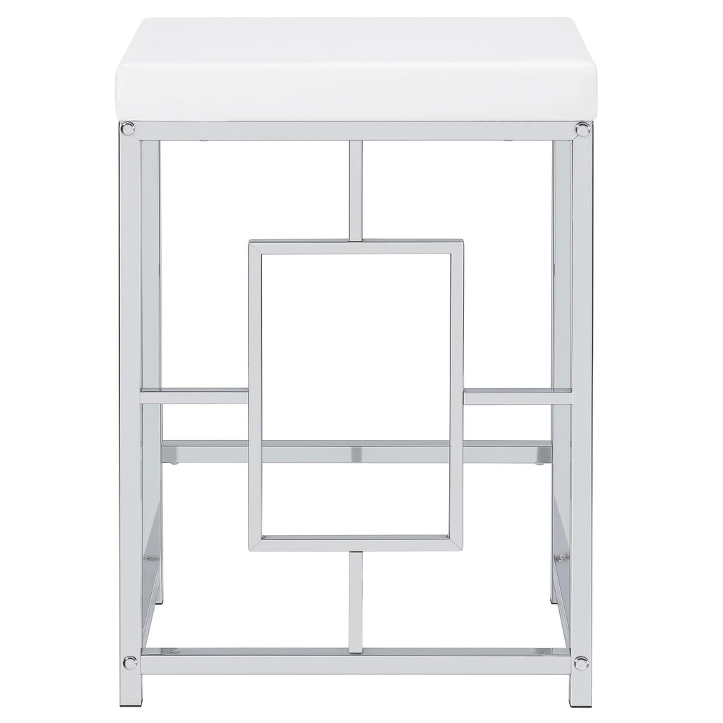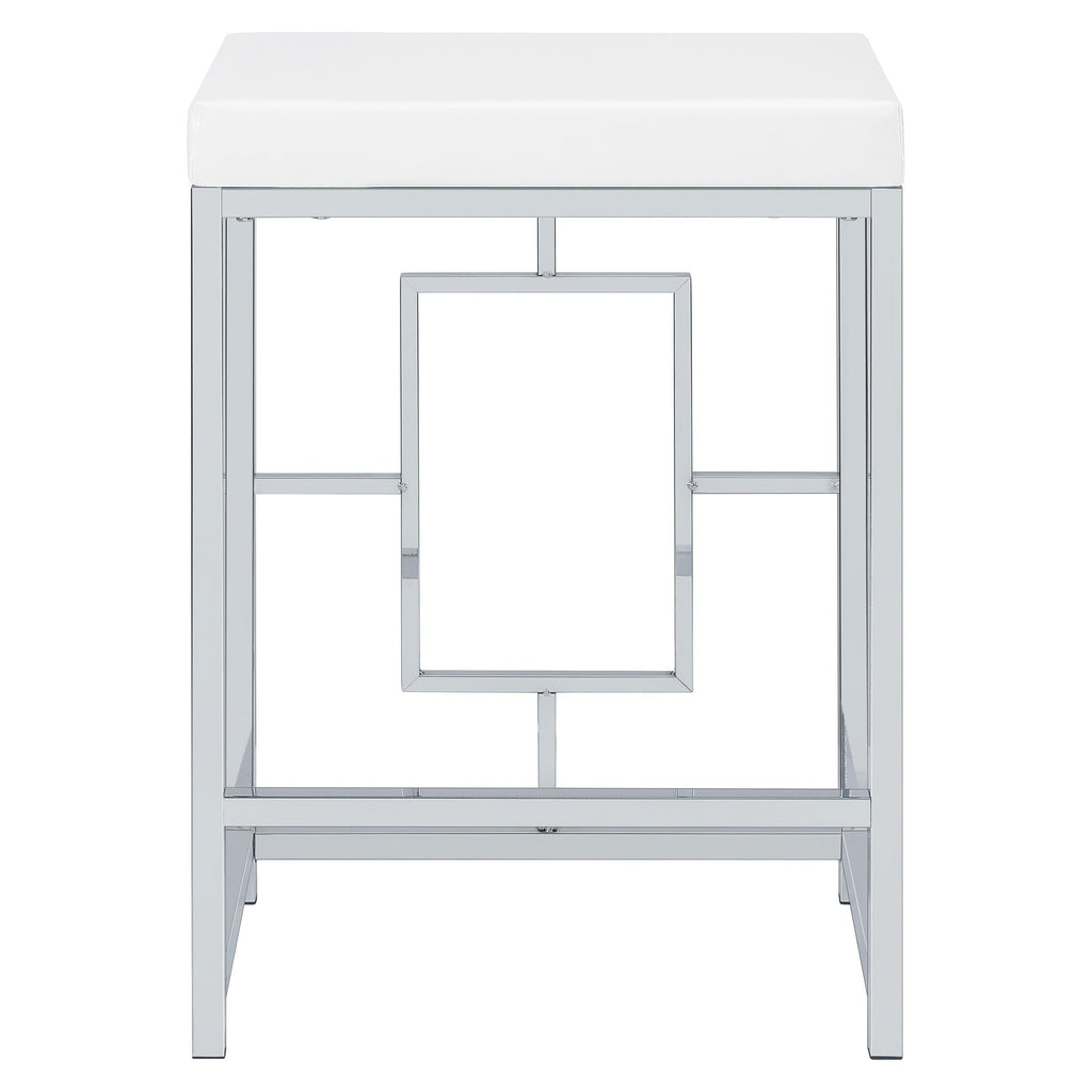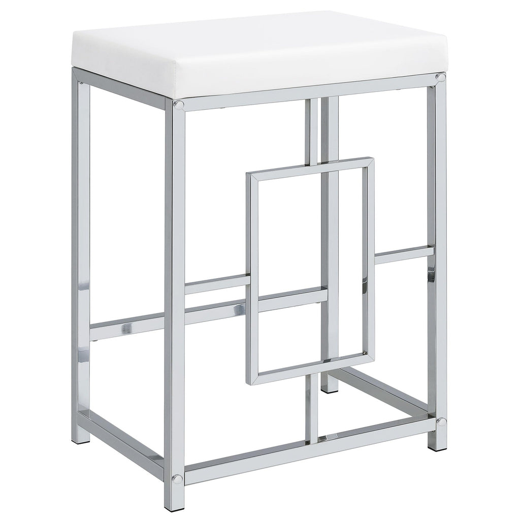 Two stools are backless, with silver finish bases and faux leather upholstery over foam padding