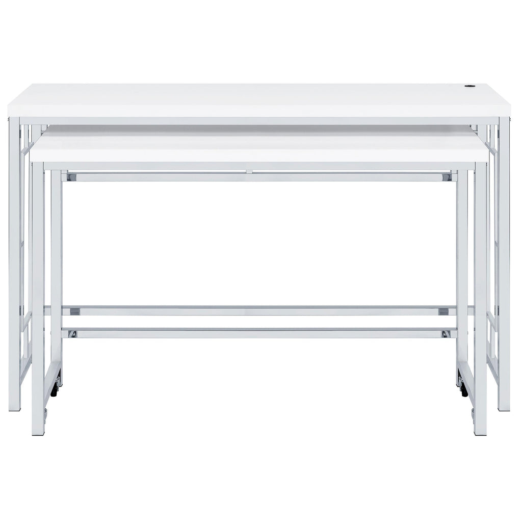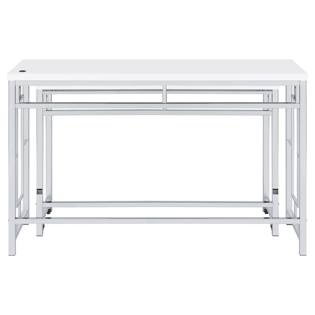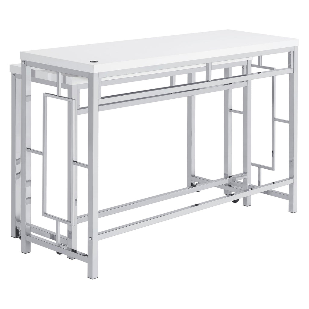You'll fall in love with the versatility and impeccable styling of a contemporary four-piece counter height dining table set that includes two nesting tables and two backless stools. Whether you're dining or working from home, the set is designed to impress, with a larger table and a smaller table on wheels that tucks underneath, creates a waterfall effect, or can be positioned in an L-shape for working from home. Its crisp white and silver finish combination highlights artistic design. The set is complete with open sides and stool bases accentuated with floating frames to bring Deco character. The large tabletop is equipped with a USB port perfect for your phone.