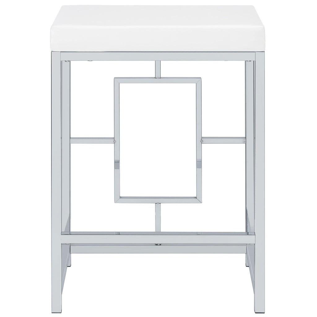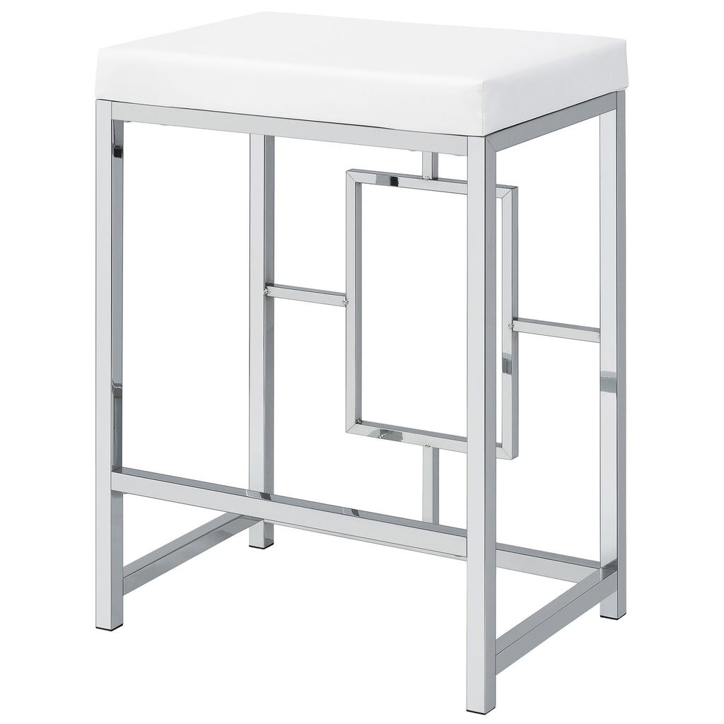 Three stools are backless, with silver finish bases and faux leather upholstery over foam padding