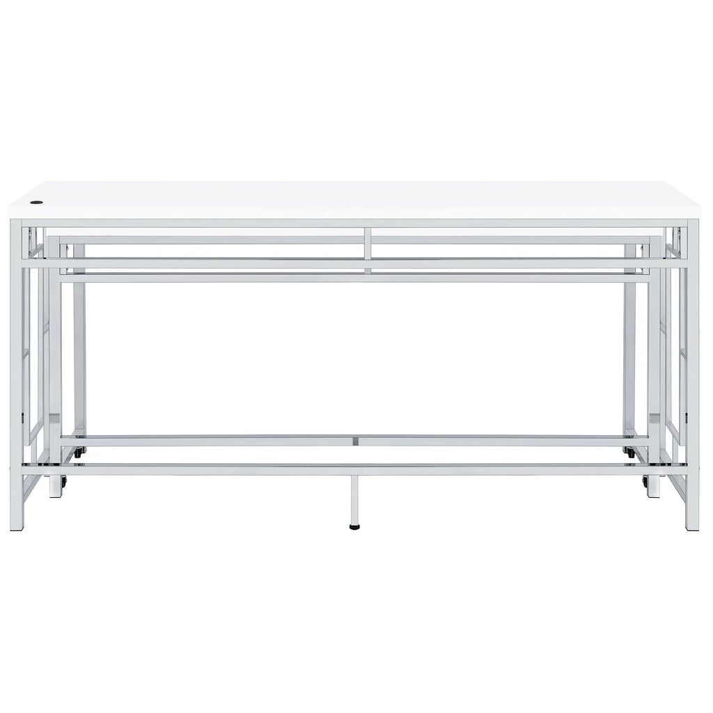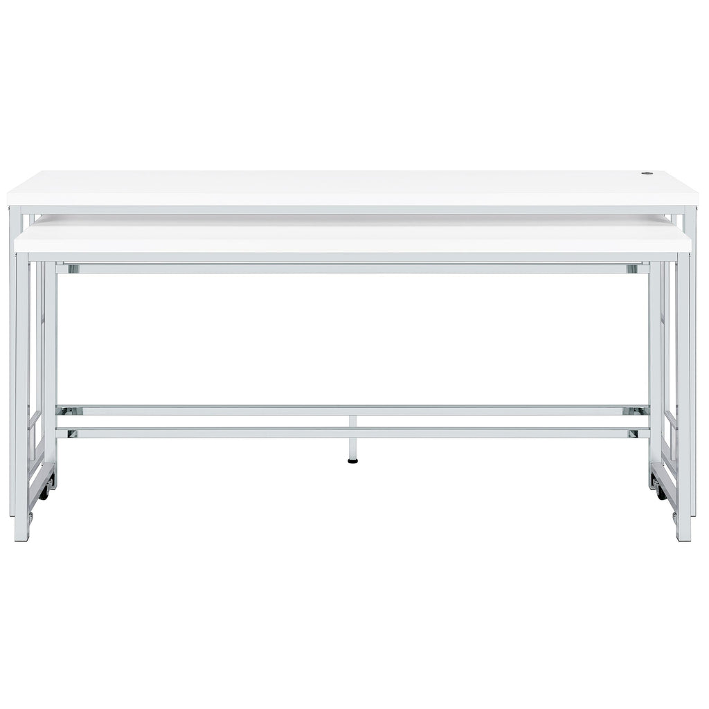 We love this modern five-piece counter height dining set in place of a console behind a floating sofa, offering exceptional versatility and refined style in any setting. It boasts two nesting tables, each long and narrow like a sofa table, but paired with three backless stools that tuck underneath. It's the perfect spot for drinks with friends on game day, or setting yourself up to work from home on a snowy day. The silver and white set features a larger table with wheels on the smaller table to create any configuration that works for you. Stools are decorated with artistic bases with open, floating frames that add Deco flair and white faux leather upholstery over padded seats for optimal comfort.
