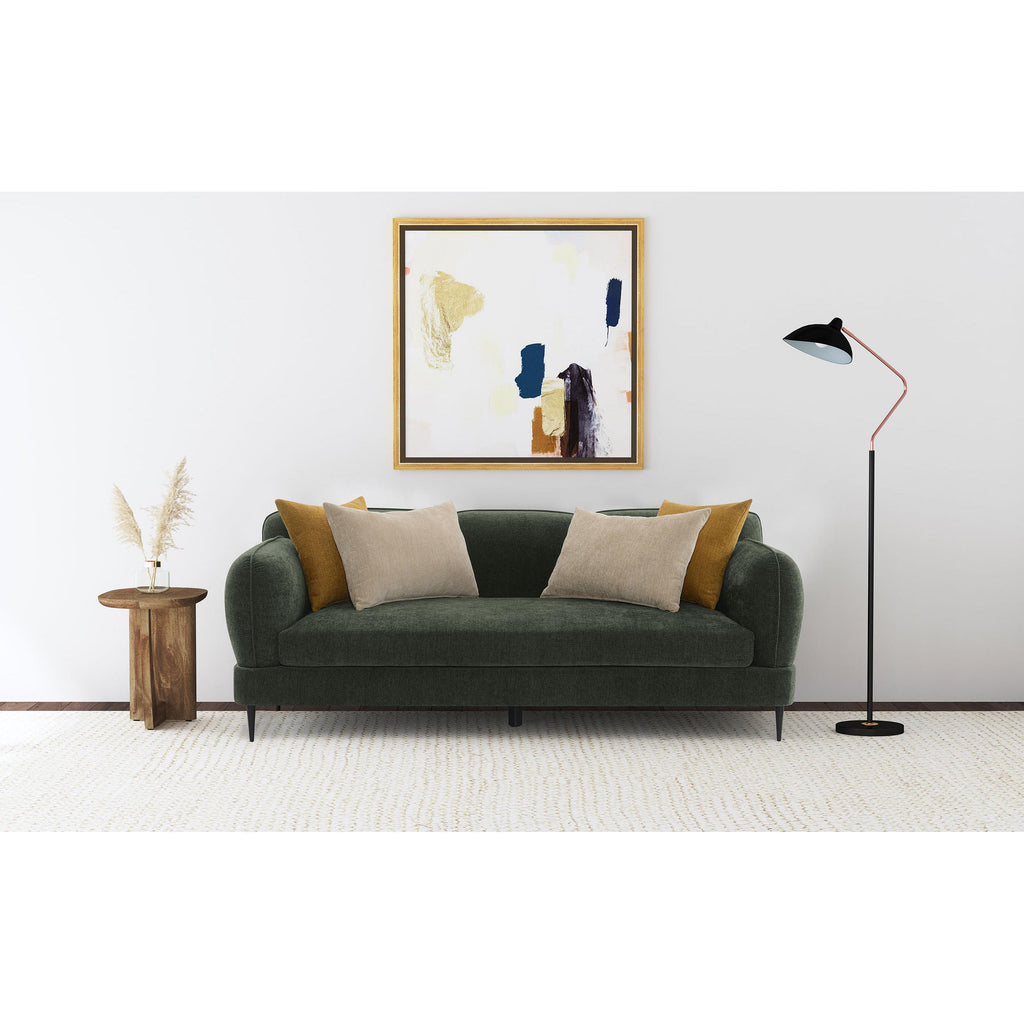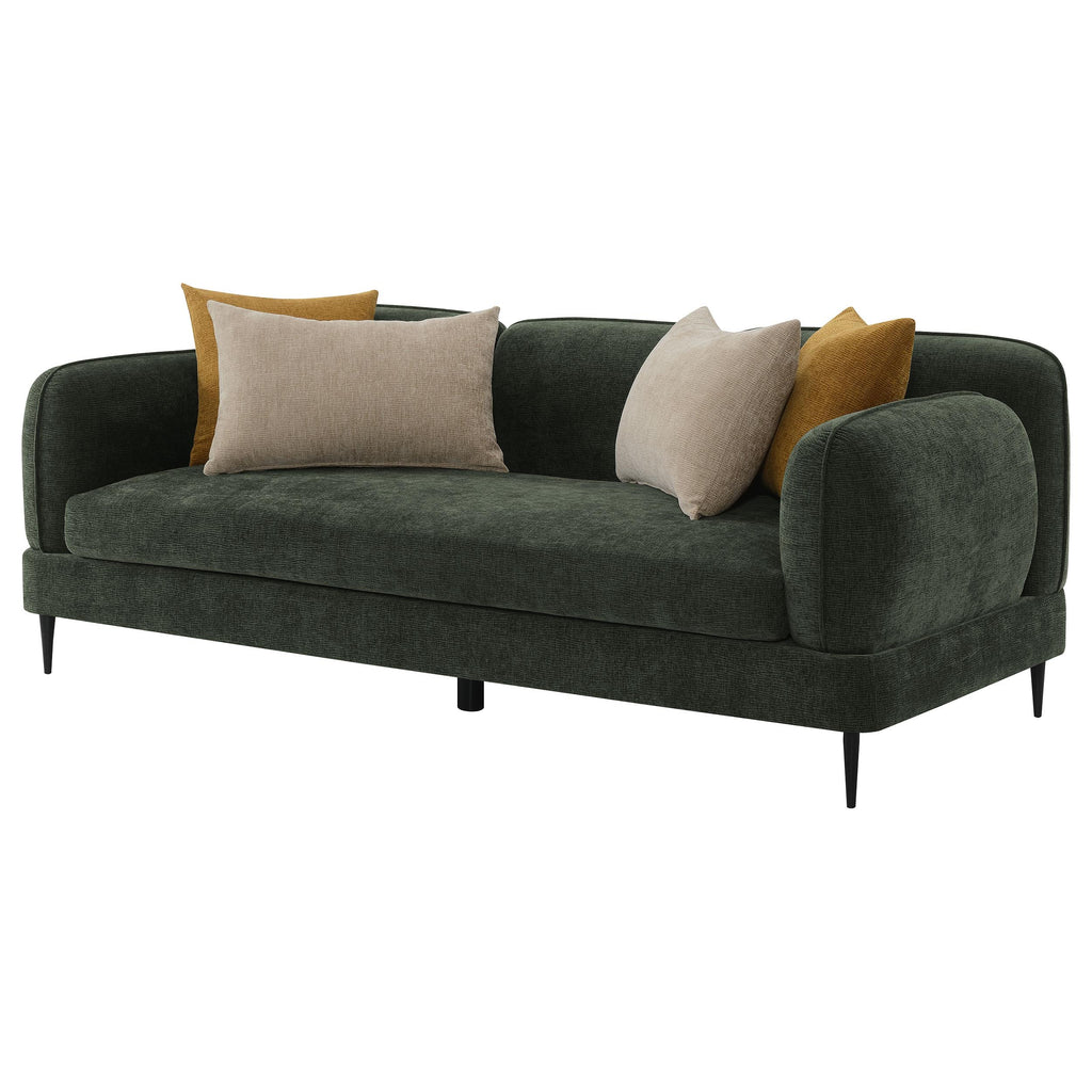 Elevate your living space with the perfect blend of style, comfort, and functionality with this modern sofa. Its sculpted round shapes and bench waterfall seat cushion create a harmonious and inviting look, enhancing any room's aesthetic. The textured chenille fabric provides an incredibly soft touch, adding a layer of luxury and durability to this standout piece. The rich green hue is perfectly complemented by vivid yellow and neutral beige accent pillows, bringing a pop of color and a touch of elegance. Supported by thin, tall metal legs, this sofa not only looks light and airy but also adds a modern touch to your home decor.