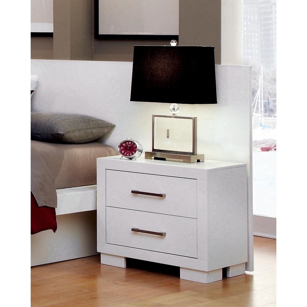 Sleek, stylish, and modern, this nightstand is a pleasing addition to any bedroom. Crafted from solid wood, it provides a sturdy surface for books, lamps, vases, and more. A soft, simple white finish provides an appealing contrast to its sharp, contemporary silhouette. Silver-tone bar handles round out its glamorous look. Two spacious drawers offer ample storage space, helping to keep your room neat and organized. The back panel helps to make a statement and a sleek headboard.