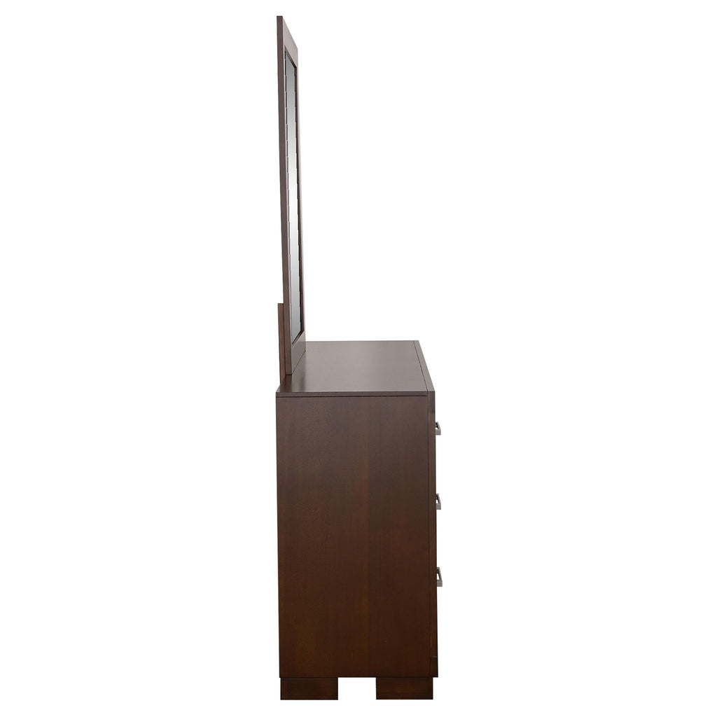 Infuse your bedroom with the sophisticated charm of this fashionable and functional six-drawer dresser. Offering ample storage with felt-lined drawers for delicate items, its rich cappuccino finish and silver bar handles exude elegance. Designed for versatility, it can grace a guest room or a master en suite with equal flair. Complete your contemporary set with the matching mirror, framed in cappuccino and featuring beveled glass, to ensure you always leave your home looking impeccable.
