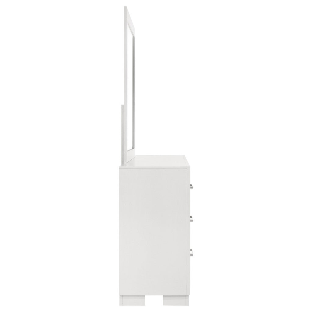 This contemporary dresser and square mirror set combines clean lines and modern design to bring elegant functionality to your bedroom. The six-drawer dresser, with a simple white finish and smooth silver handles, offers ample storage and organization space. Its felt-lined upper drawers protect delicate items, adding subtle glamour to its sleek silhouette. The solid wood construction ensures durability. The matching square mirror, with its crisp, clean frame, complements a range of decor styles, from traditional to contemporary, dressing up the dresser with its stark neutral color.