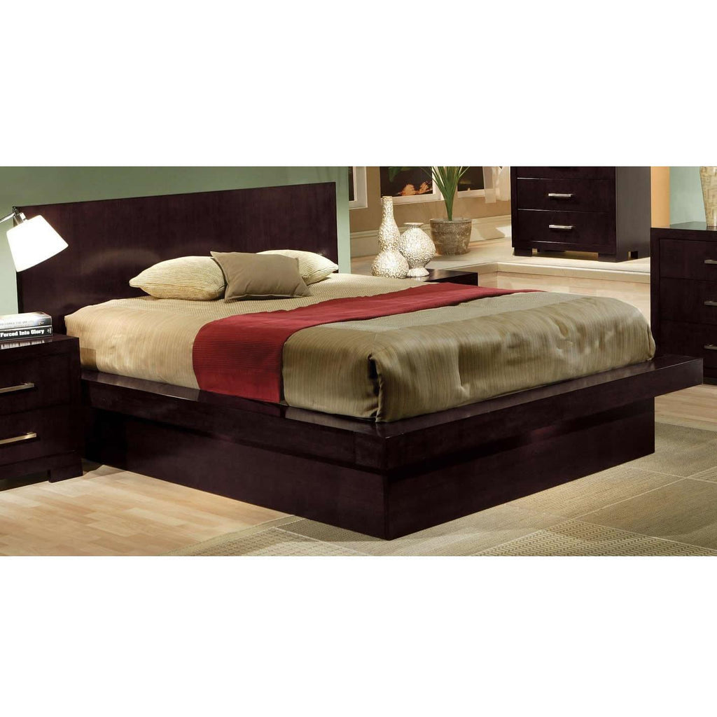 This Jessica queen bed highlights this contemporary collection. It is designed to be the main feature of a master bedroom. Fashioned from gorgeous solid wood and veneers, the bed features a high headboard and split level mattress base and solid floor base. Sturdy bed is finished in your choice of cappuccino or white. Consider the optional nightstand panel to place the companion nightstand (not included) within easy reach.
