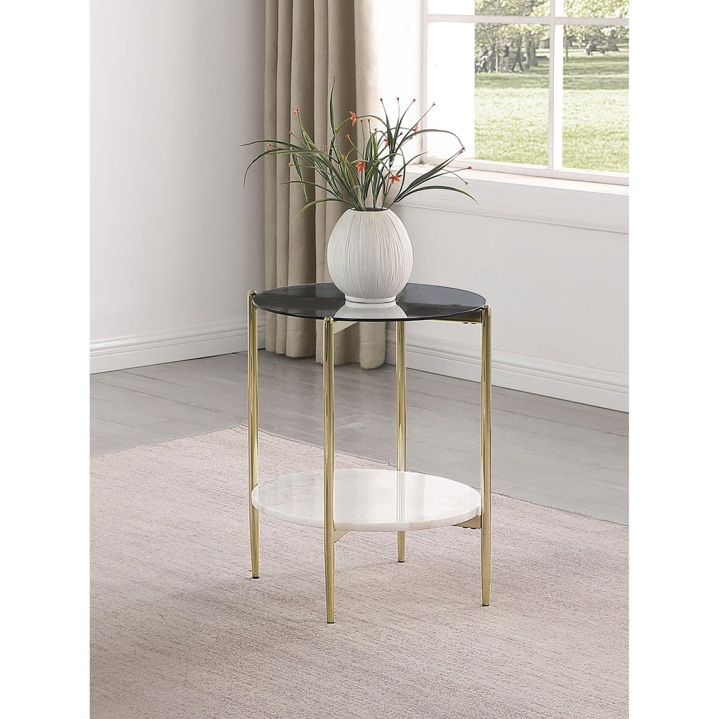 Add a glamorous touch to your living room or entryway with this modern round end table, also perfect as a side table. The gold electroplated chrome frame features slim legs and crossing stretchers, offering a sleek and sophisticated look. The smoke gray tempered glass tabletop creates a chic, contemporary aesthetic. Beneath, the white marble lower shelf provides an elegant space for decor, while leaving the tabletop free for beverages or a tasteful accent like a vase or lamp.