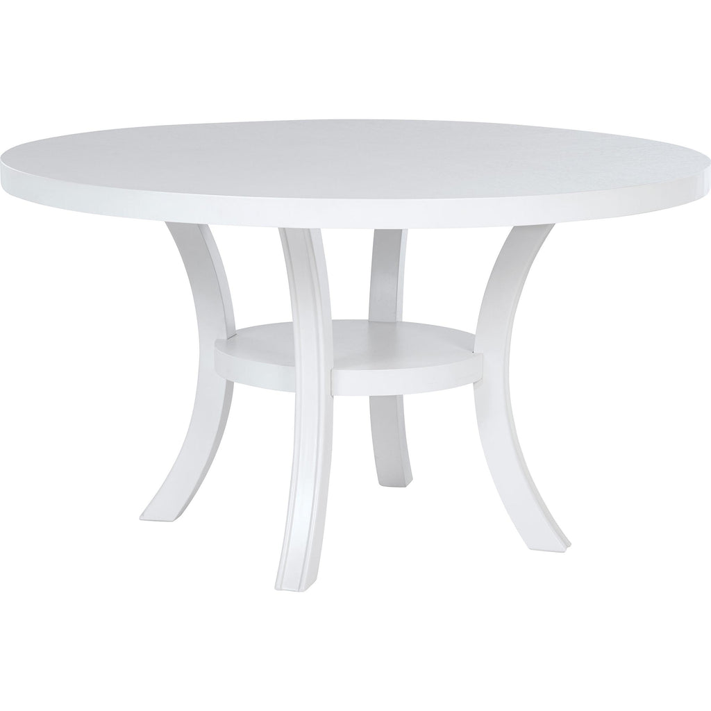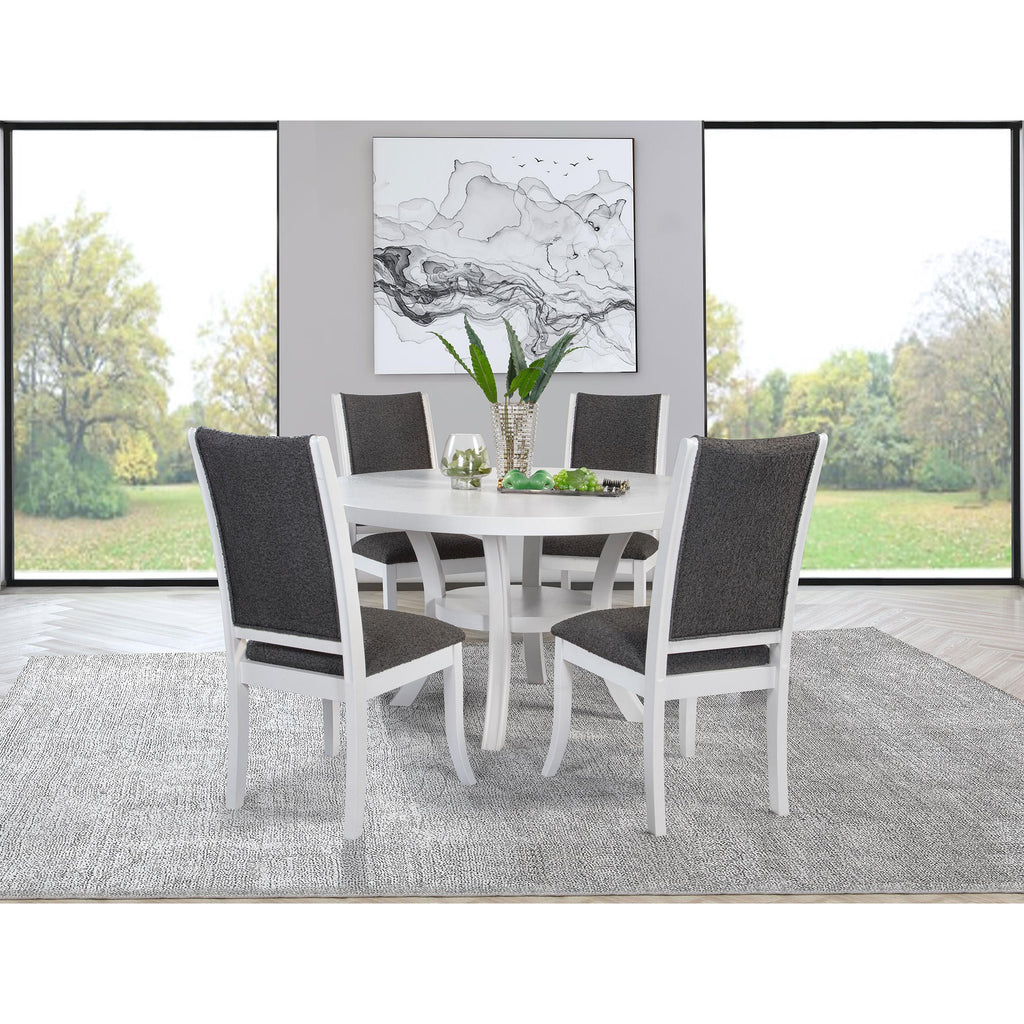 Embrace a modern minimalist presentation with this contemporary dining set. It centers on a roomy round dining table that seats four to six, with flared legs and a round shelf that adds stability and decorative potential. The set adds side chairs, each with a tall, structured silhouette and dark grey upholstery over plush foam cushions. A pearl white finish is clean and fresh, offering plenty of contrast against the grey. The set instills a clean, precise aesthetic, perfect for minimalist or maximalist decor themes. This set includes one dining table and four chairs.