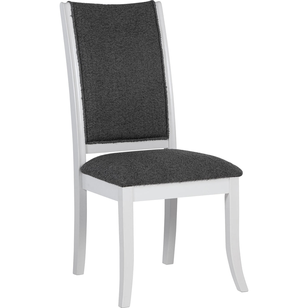 Embrace a modern minimalist presentation with this contemporary dining set. It centers on a roomy round dining table that seats four to six, with flared legs and a round shelf that adds stability and decorative potential. The set adds side chairs, each with a tall, structured silhouette and dark grey upholstery over plush foam cushions. A pearl white finish is clean and fresh, offering plenty of contrast against the grey. The set instills a clean, precise aesthetic, perfect for minimalist or maximalist decor themes. This set includes one dining table and six chairs.