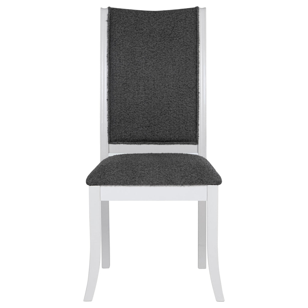 Dimensional gray upholstery creates engaging contrast and depth for this set of two modern dining chairs. Each boasts a tall, refined silhouette that's armless to create a smooth, streamlined silhouette. Cushions are padded with foam and covered in dark gray upholstery. A pearl white finish adds crisp, clean character, delivering a look that works beautifully in a variety of spaces and decor styles. Chairs are complete with flared front legs and squared edges that encourage a clean, precise look.