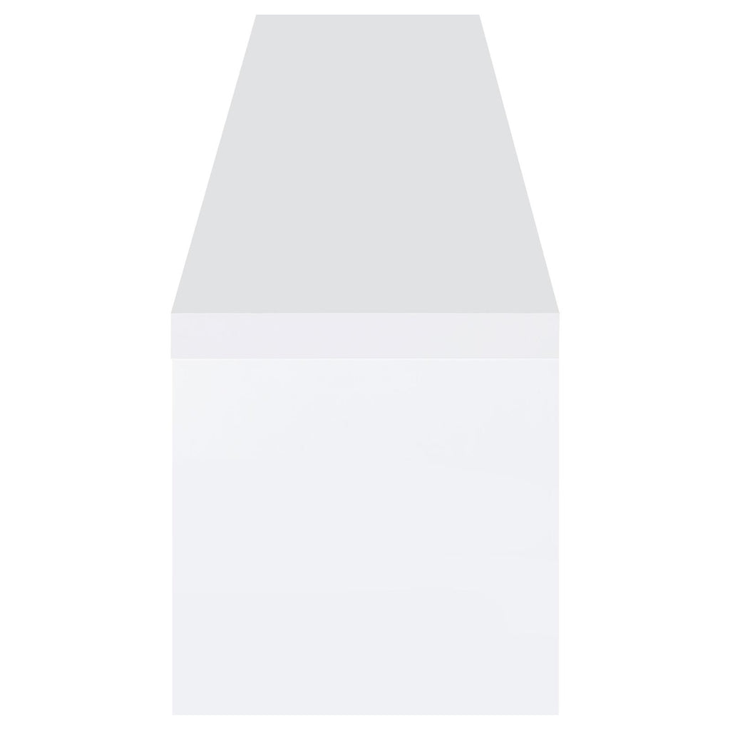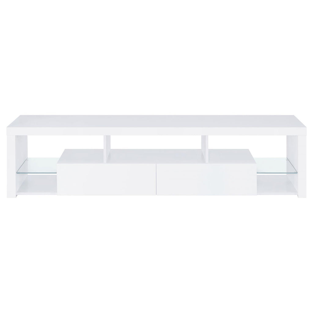 • Sleek, modern TV stand with pristine glossy white finish and clear glass accents
