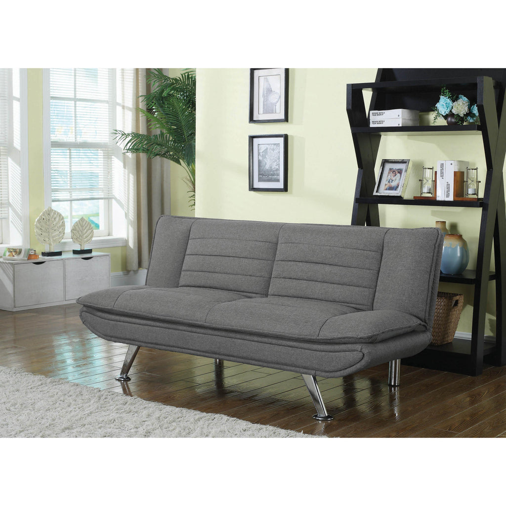 With a sleek, modern silhouette, this sofa bed adds contemporary glamour to any living space. Featuring pillow-top seating over sinuous spring decking with high-density foam, it creates a comfortable space for leisurely relaxation. Its attractive look is enhanced by tufted stitching and high-shine metal legs finished in chrome. Soft, grey, woven fabric upholstery pulls it together with style and grace. It easily converts from sofa to bed for a variety of cozy, convenient uses.