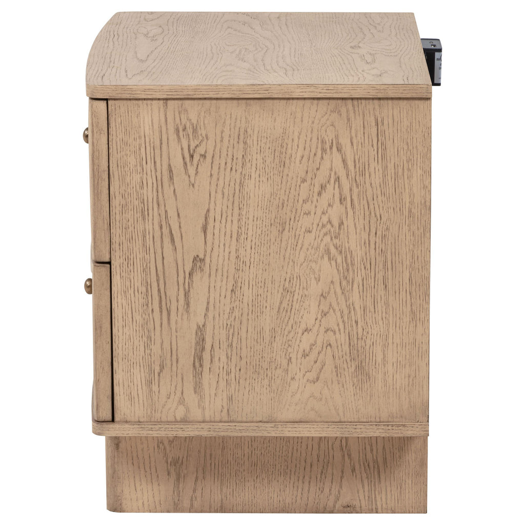 This nightstand combines practicality with elegant design, offering two drawers for convenient bedside storage. Finished in beige oak, it features smooth metal extension glides for easy access and antique brass hardware for a touch of vintage charm. The integrated USB and Type-C charging ports keep your devices powered and within reach. Its clean lines and thoughtful details make this nightstand a perfect fit for any bedroom setting. Enjoy the perfect balance of function and style with this essential piece.