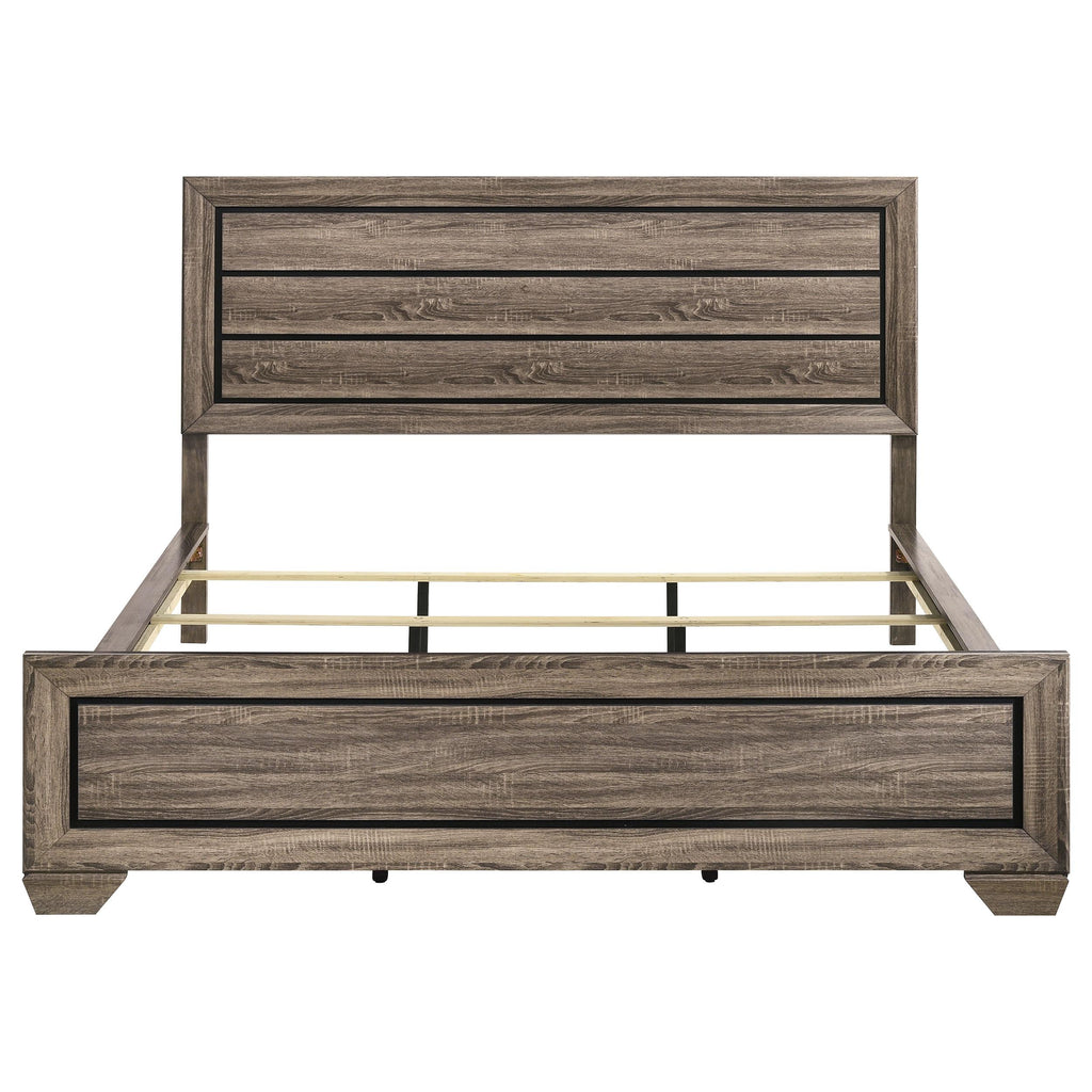 Make a statement in a transitional room. Cherish the linear styling and fresh finish of this sophisticated bed. An extra high headboard with horizontal planks hint at a nature-inspired theme. With a gorgeous grey patina in a greyish brown tone, its washed taupe finish is wonderfully versatile. A framed case front adds dimension and elegance.
