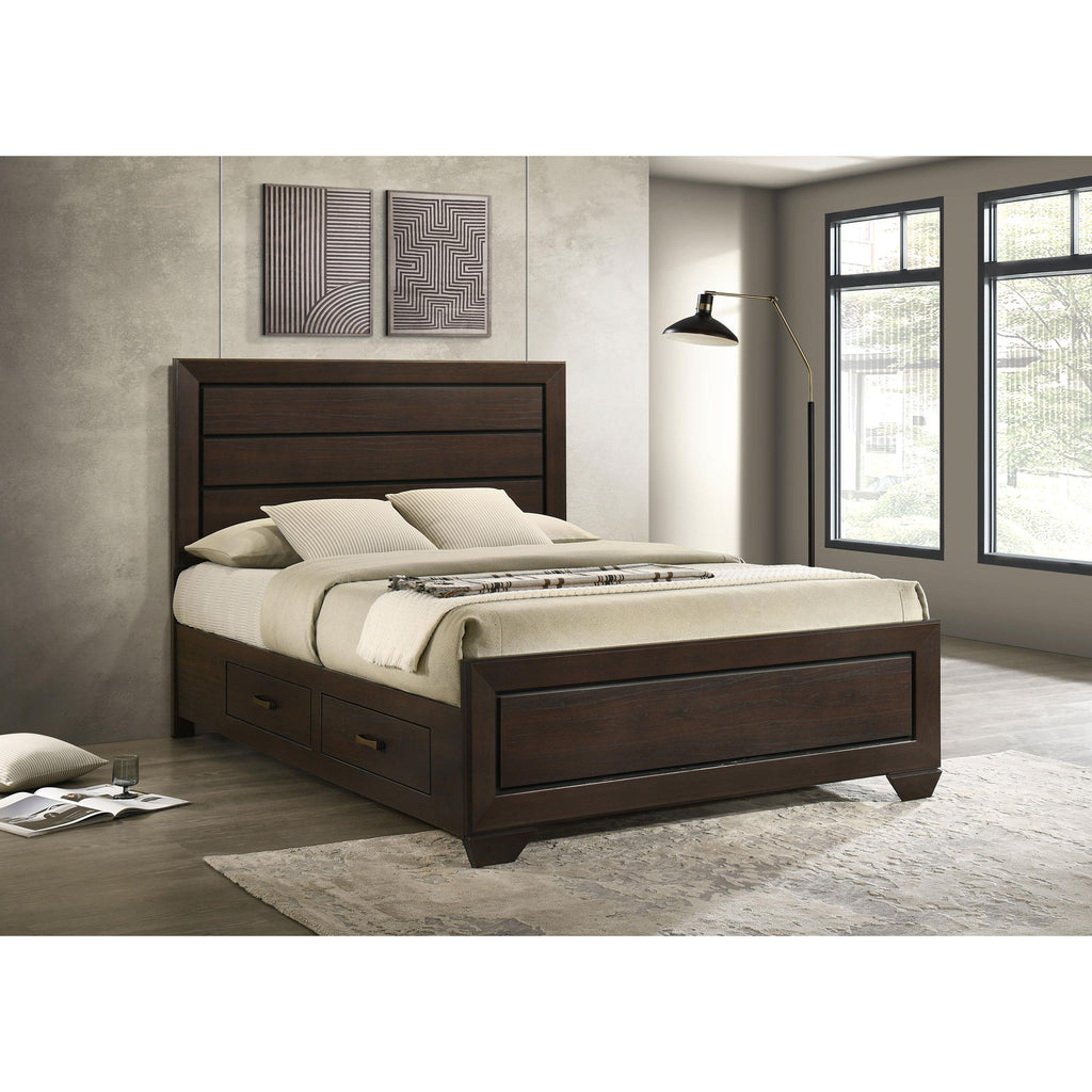 Art and engineering meet to refresh a transitional bedroom. This stylish bed offers a hint of rustic charm and a sophisticated attitude. With a dark cocoa finish, contrasting black recessed grooves deliver a touch of drama. Enjoy bonus storage drawers on its side. This bed begins an eye-catching ensemble that lasts through room redesigns.