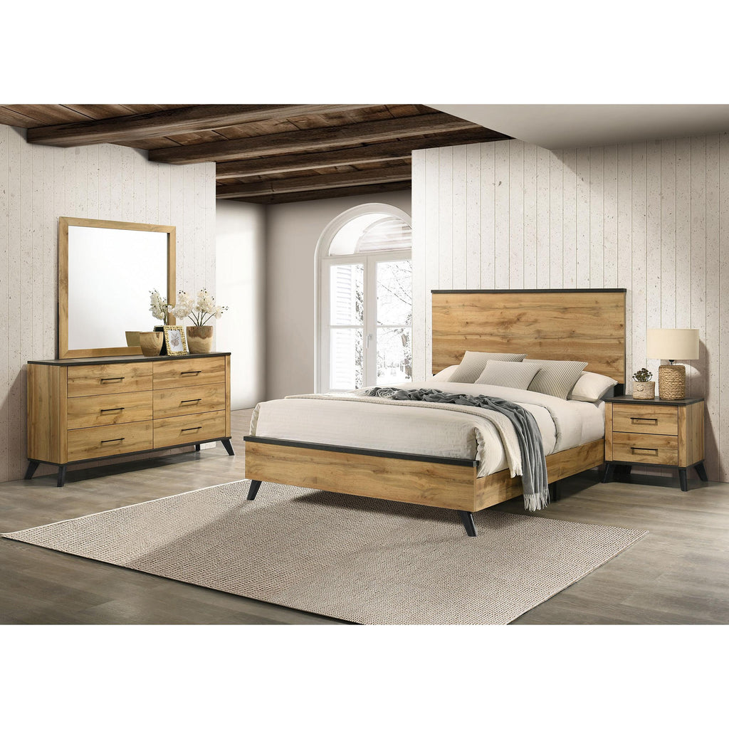 Transform your bedroom into a stylish retreat with this bedroom set. Combining mid-century modern design with a rustic wood grain effect, this set creates a warm and sophisticated ambiance. The weathered brown and natural pine finish, accented by matte black metal pull handles, adds warmth and sophistication to your space. Crafted from durable engineered 3D paper veneer, each piece offers both style and functionality, ensuring a cohesive and elegant look for your bedroom.