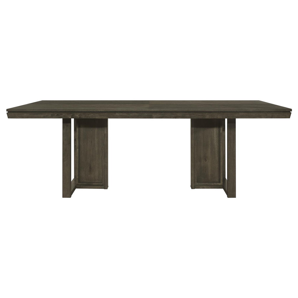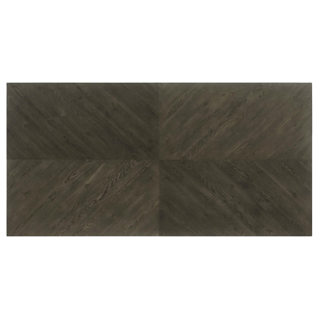 Take your dining experience to new heights with our chic transitional table. The sleek dark grey finish, adorned with a subtle chevron pattern, adds a touch of elegance to any space. The table's simple trestle base design brings a modern touch, completing the sophisticated look. Elevate your dining area with this exquisite table, where style meets functionality for unforgettable gatherings.