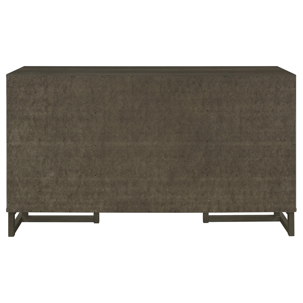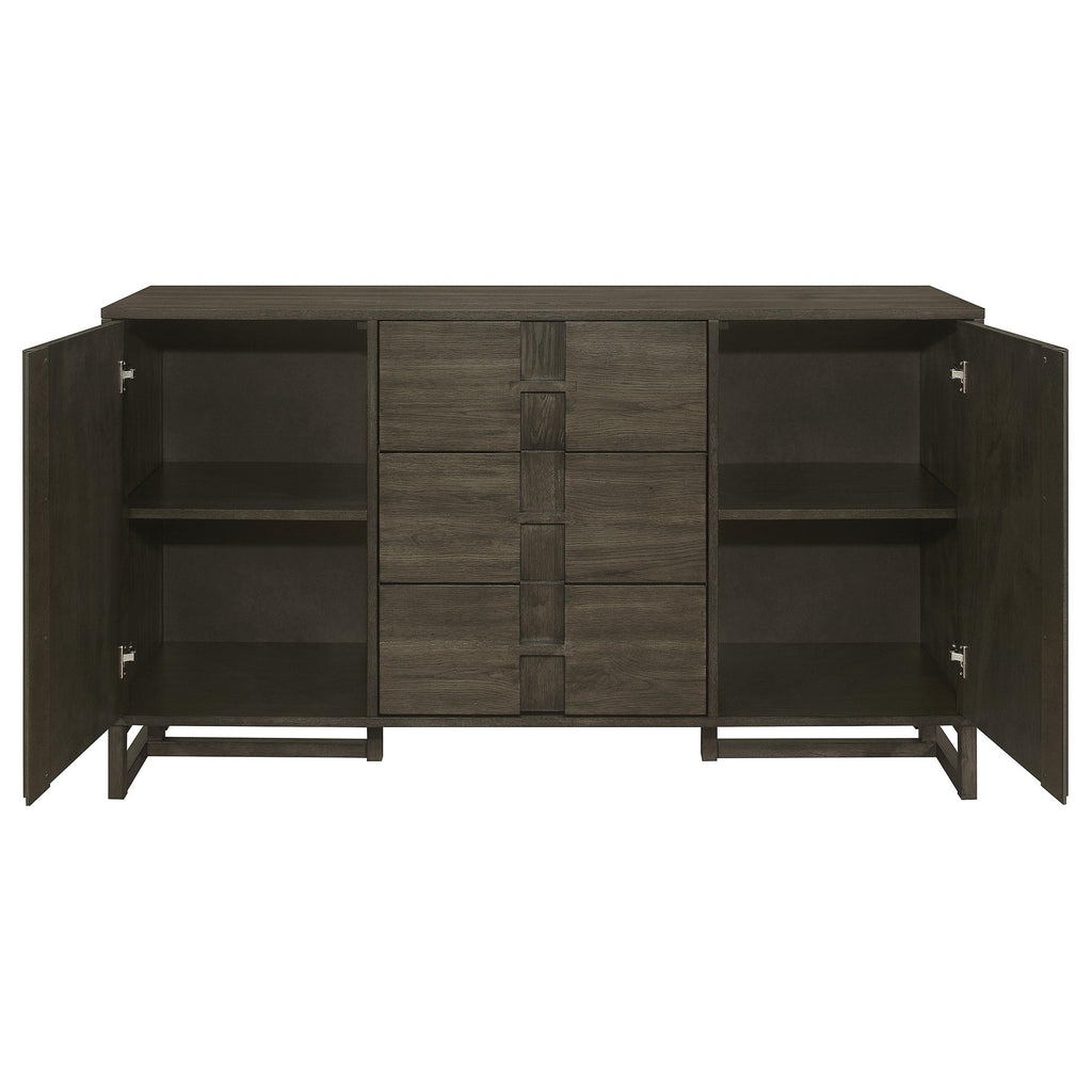 Transform your dining space with our stylish server, designed to enhance both functionality and style. This server features two door cabinets, three drawers, and two shelves, providing ample storage for your dining essentials. The sleek dark grey finish exudes modern elegance, while the brown felt-lined top drawers add a luxurious touch. Elevate your dining experience with this exquisite server, combining practicality and sophistication seamlessly.