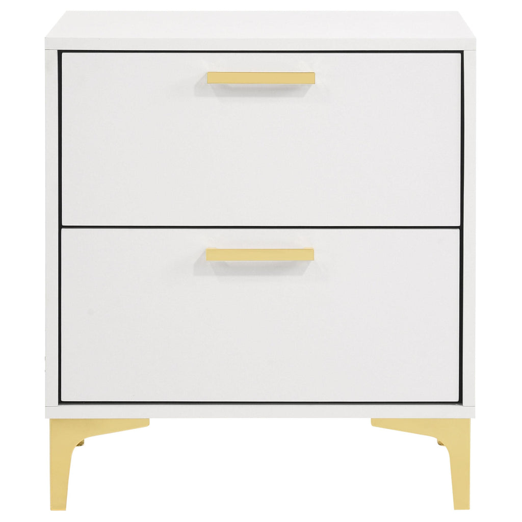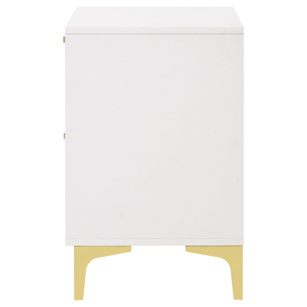 Flank your bedside with this modern glam nightstand. Designed with an elegantly understated, boxy frame, this two-drawer nightstand lends a chic, contemporary aesthetic. Clean lines and a bright, white finish elevate its sophisticated nature. Fastened to each deep drawer is a slim gold pull handle for a touch of metal. Unifying the warm metallic elements are gold bracket style legs that lend a retro look and feel.