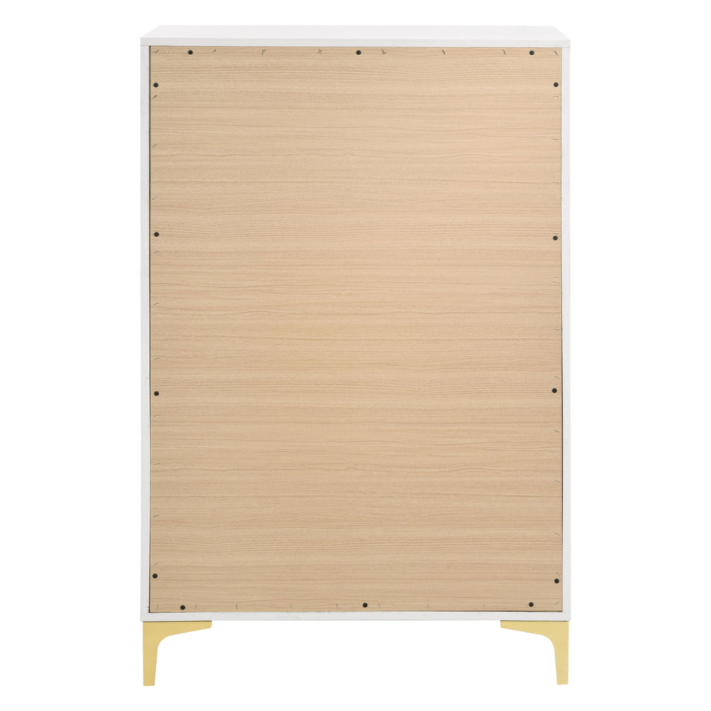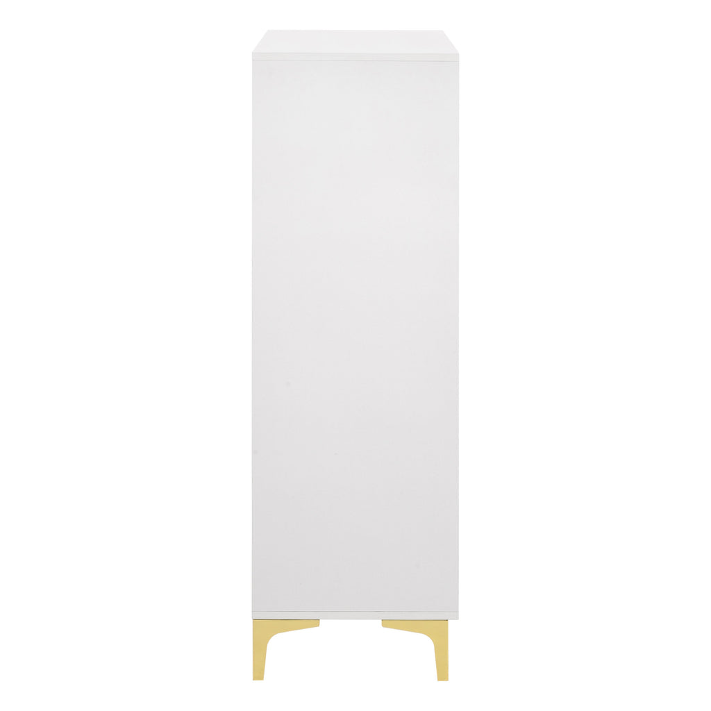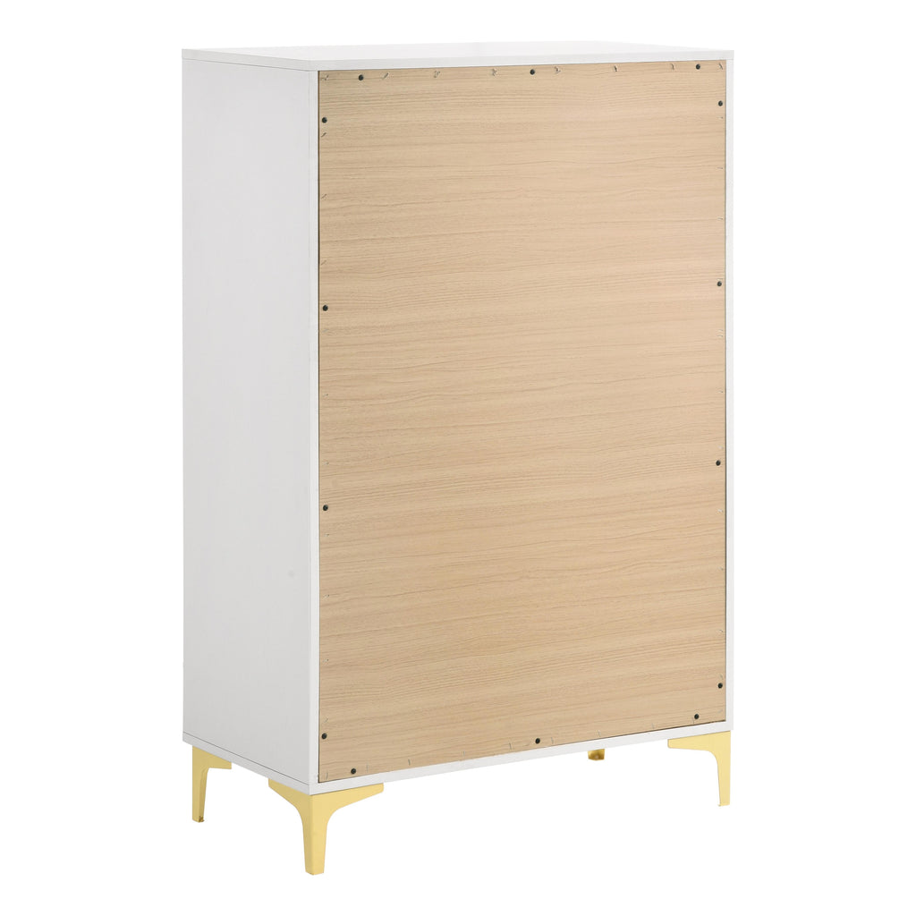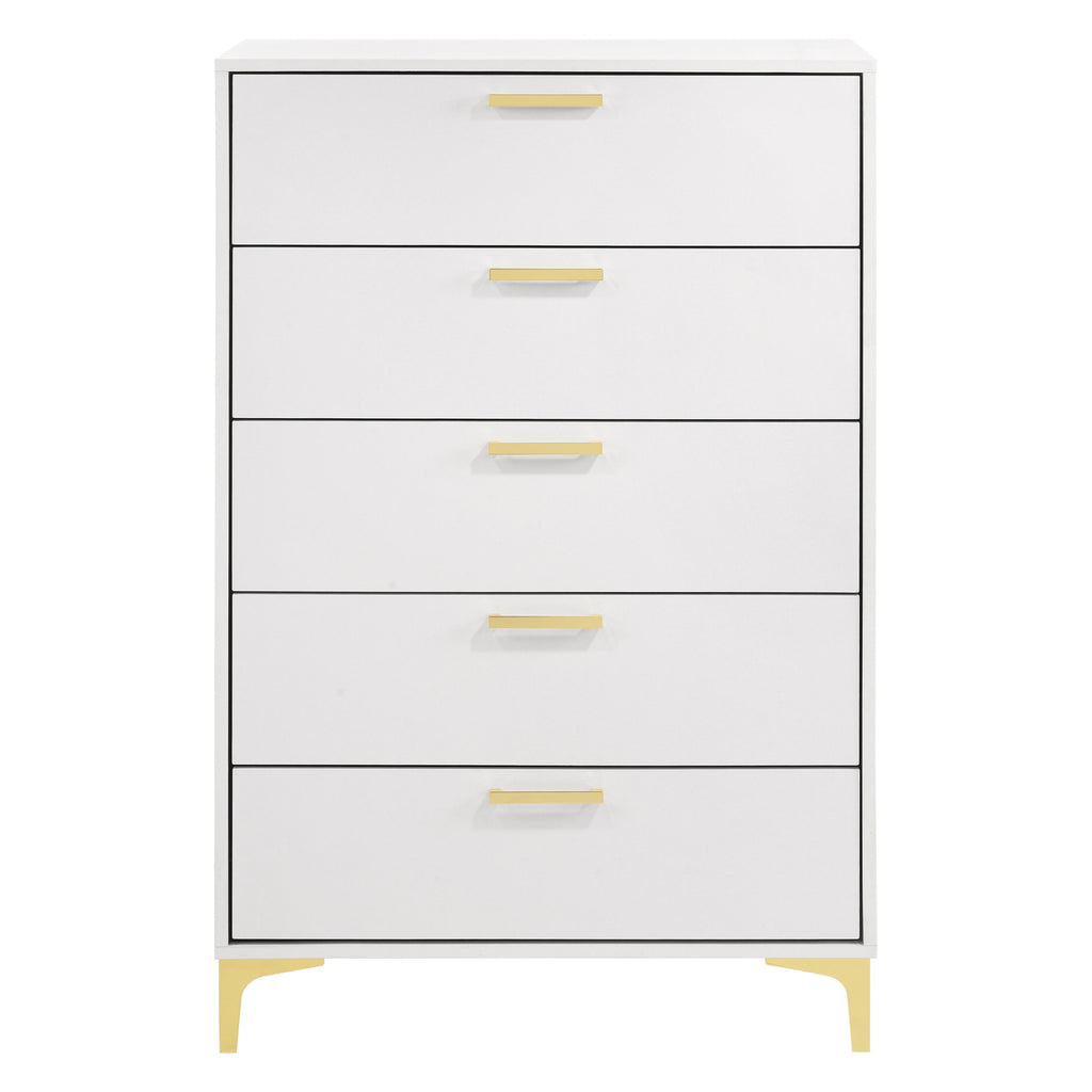 Open up your tight bedroom floor plan with this stately modern glam chest. Five spacious drawers stacked on top of one another keep garments and bedroom essentials stowed away and organized, helping you find what you need fast. A bright, white finish offers a sleek elegance, set off by warm golden accents. Along each of the five drawers is a slender gold finished pull, matched by the golden bracket legs that lift it up. Place this stunning five-drawer chest in your bedroom for an elegantly understated contemporary aesthetic.