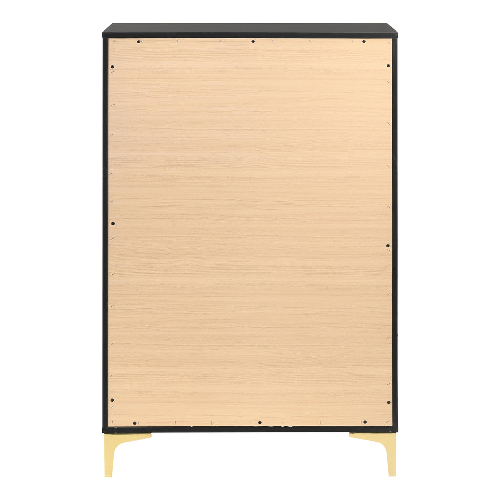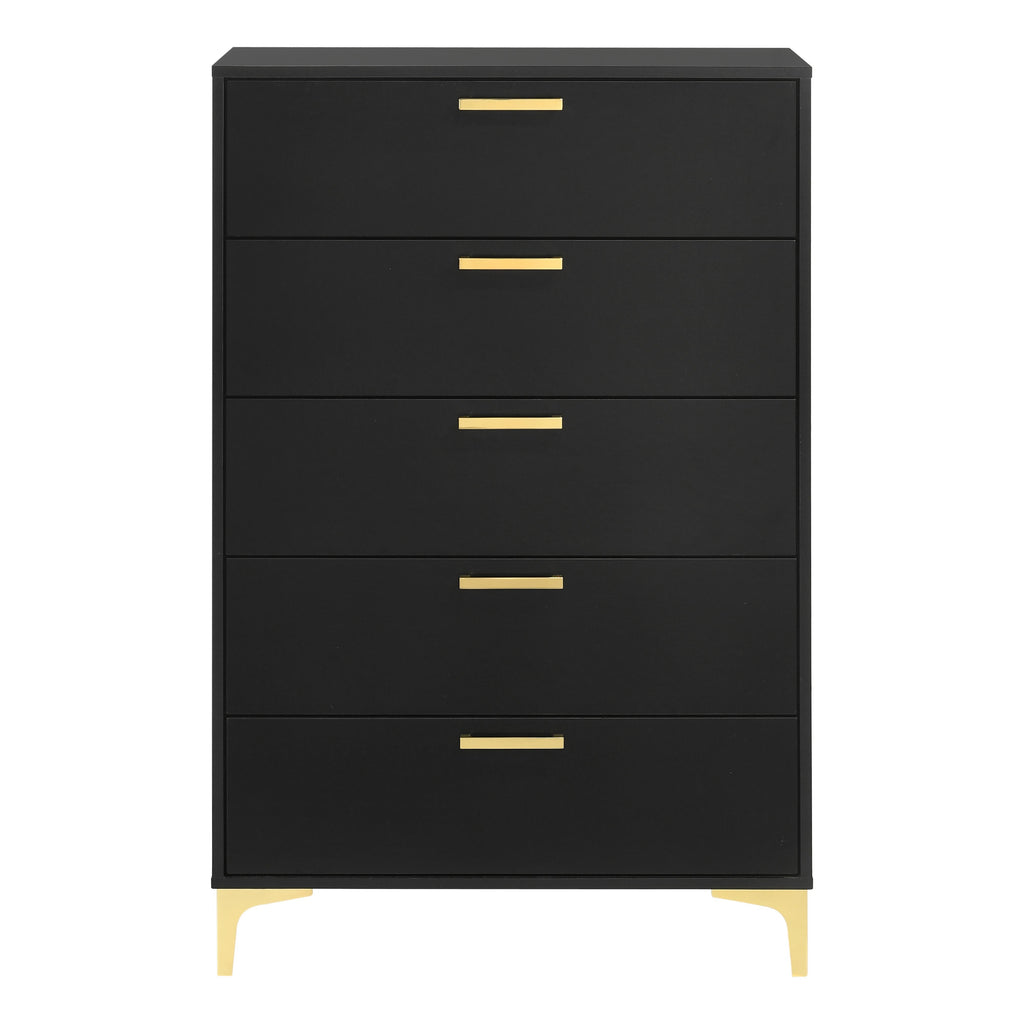 Organize garments, bed linens, and much more in this modern glam chest. Space-saving and tall with a simple, boxy frame, this five-drawer chest keeps your bedroom floor space open and free. A smooth, black finish presents a bold contrast and dramatic flair to focal walls and spaces. Each of the five spacious drawers is fastened with a chic, gold finished pull handle that lends a warm metallic accent. Bracket style legs mirror the golden metallic hues, offering a slight elevation and extra support to this stunning modern five-drawer chest.