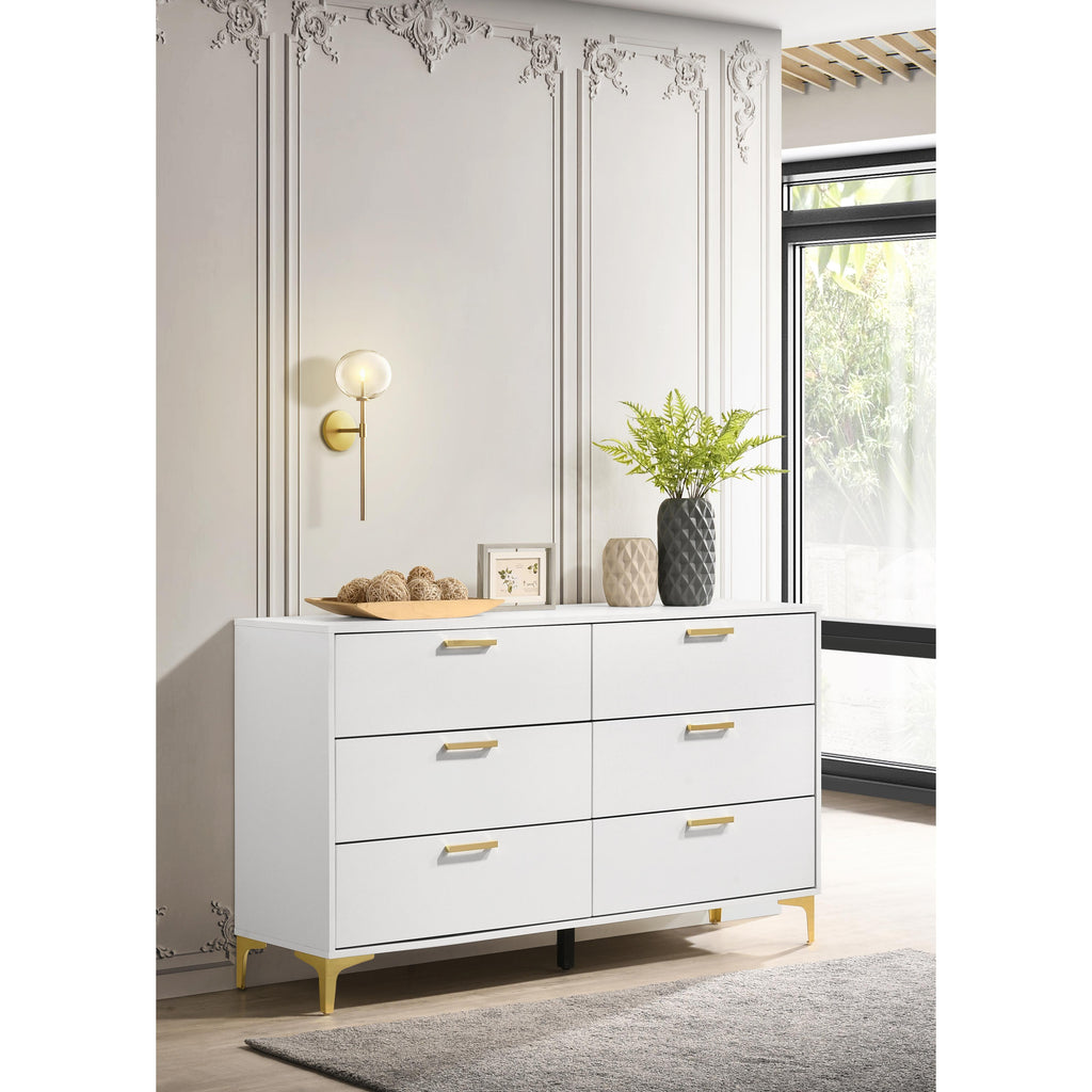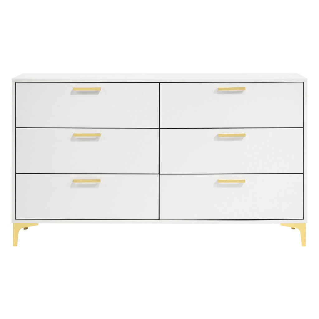 Maintain a cheerful and luxe bedroom with this splendid modern glam dresser. A perfect statement piece for contemporary bedrooms, this six-drawer dresser presents a light and airy expression. Accented with gold finished drawer pulls and bracket style legs, a luxe vibe shines through. The crisp, white finish maintains a sleek, dignified presence as well. Long and narrow, this dresser makes a lovely addition to your bedroom's focal wall and grounds a vanity dressing area.