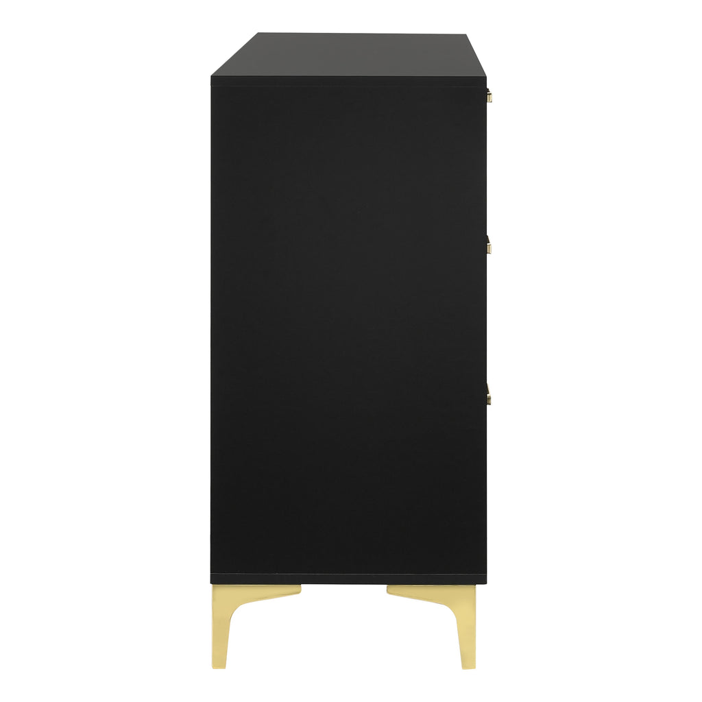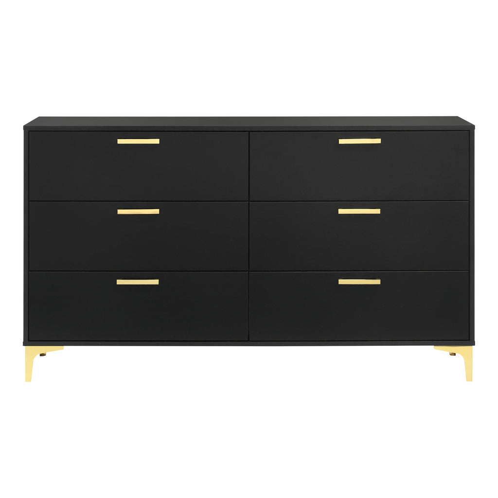 Space-saving and elegantly understated, this modern glam dresser offers plenty of space to store all wardrobe items. A boxy frame with a smooth black finish presents a bold, handsome look and creates a striking focal wall. Six spacious drawers make room for pajamas and garments, keeping your top surface neat and tidy. Each drawer is adorned with a slender gold pull handle that offers a sleek metallic accent. Gold finished bracket legs mirror the hardware, offering a unified look and feel.