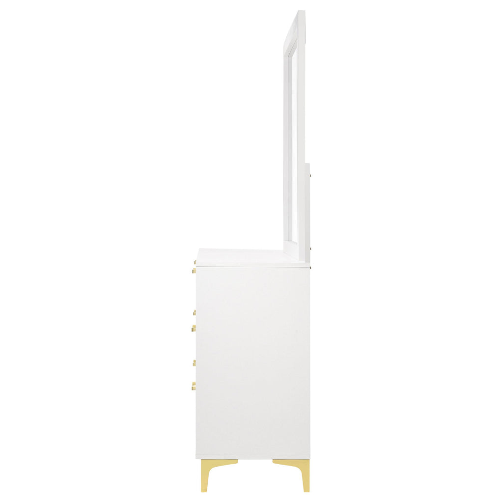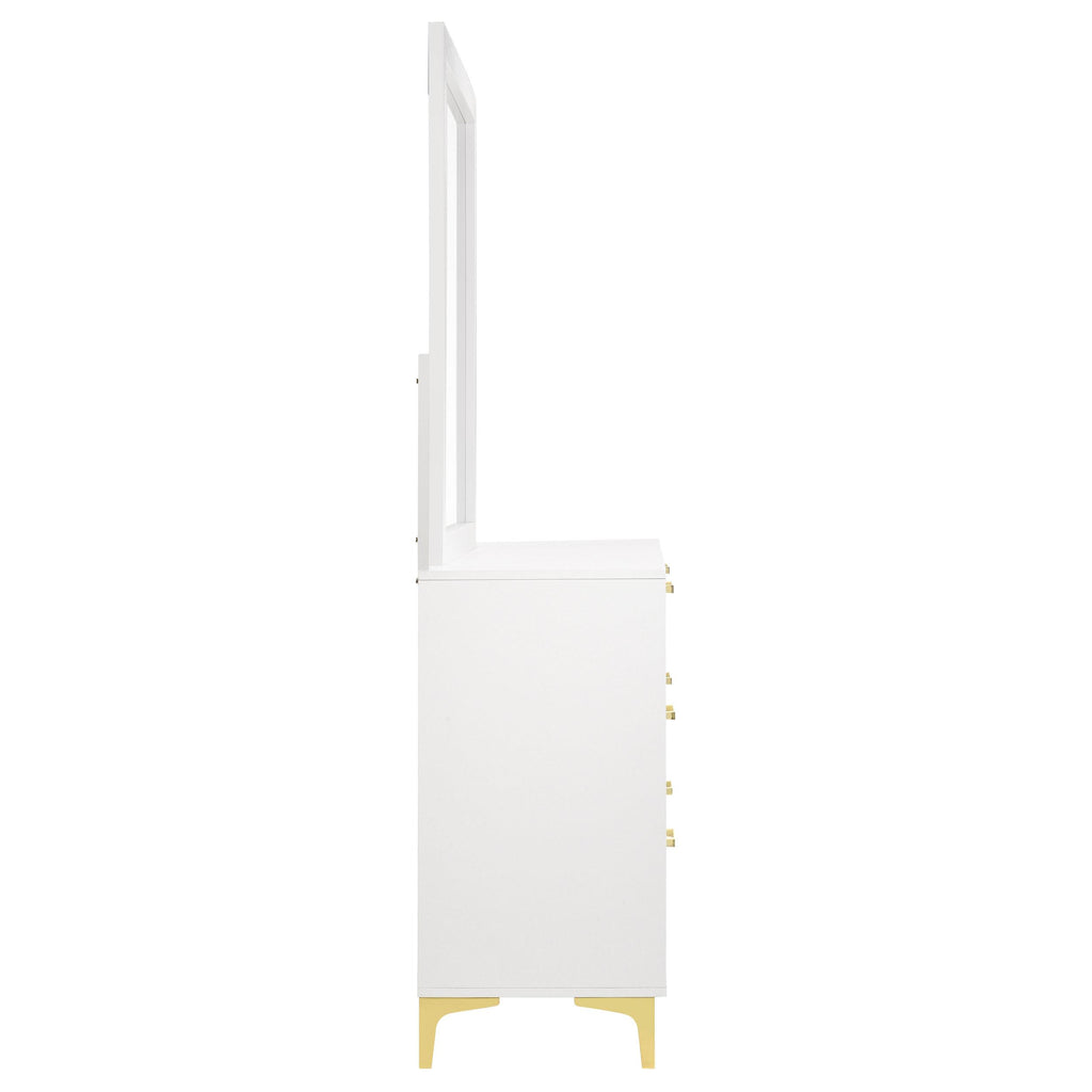 Brighten up your bedroom with the modern glam and cheer of this six-drawer dresser, a statement piece that brings a light and airy feel to contemporary spaces. Gold-finished pulls and bracket-style legs infuse the piece with a touch of luxury, while the crisp white finish keeps it sleek and dignified. Ideal for anchoring your focal wall or complementing a vanity area, this long and narrow dresser is a splendid addition. The accompanying contemporary mirror, framed in white, adds height and elegance, creating a formal vanity when placed atop the dresser.