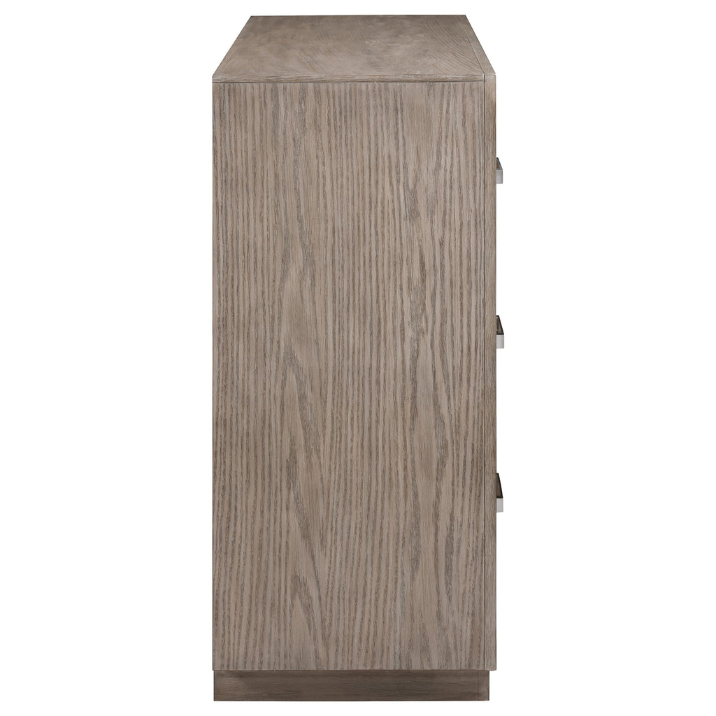 Enjoy the roomy storage and understated character of a modern six-drawer dresser. It's a fresh, understated design that showcases a wide top and recessed base that pair to deliver a timeless look. The dresser shows off wood grain details in a neutral barley brown finish, delivering stylish flair that complements in any setting. Each drawer is equally sized for easy storage and organization. Chrome finish bar pulls add a touch of contrast and textural appeal.