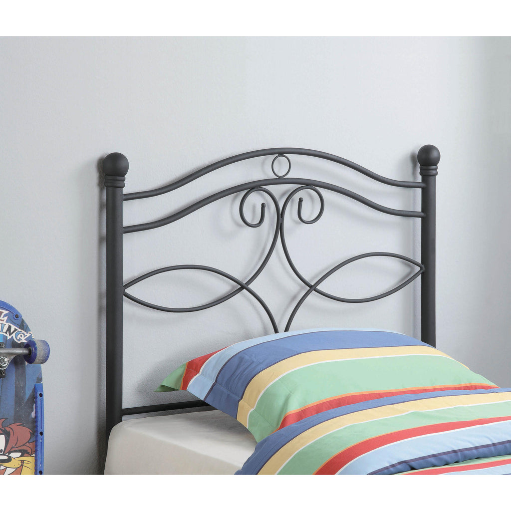 This metal twin headboard adds a sleek, unique panache to a simple metal bed frame. It features two gently arched curves at the top with metal rods underneath fashioned in ornate curves and swirls for a stylishly elaborate appearance. Both posts are topped by round knobs that are simple yet appealing. Finished in understated matte black that suits any modern decor. Also comes in full and queen sizes.