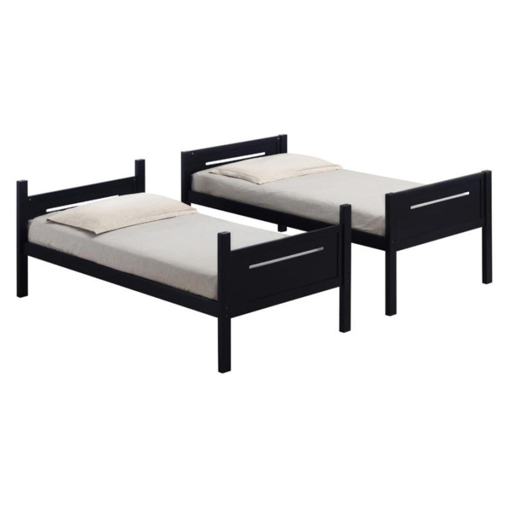 Space-saving with a clean and minimalist aesthetic, this youth bunk bed features a modern style frame that lends a masculine vibe. Perfect for making more floor space, this bunk bed offers a square design with a straight headboard and footboard, each with a slim notched out space. Available in several colors, this bunk bed complements any room's current color palette. An angled ladder allows kids to get to the top bunk, which also offers secure guardrails on each side. The bunk bed can be separated into two to create side by side beds as well.