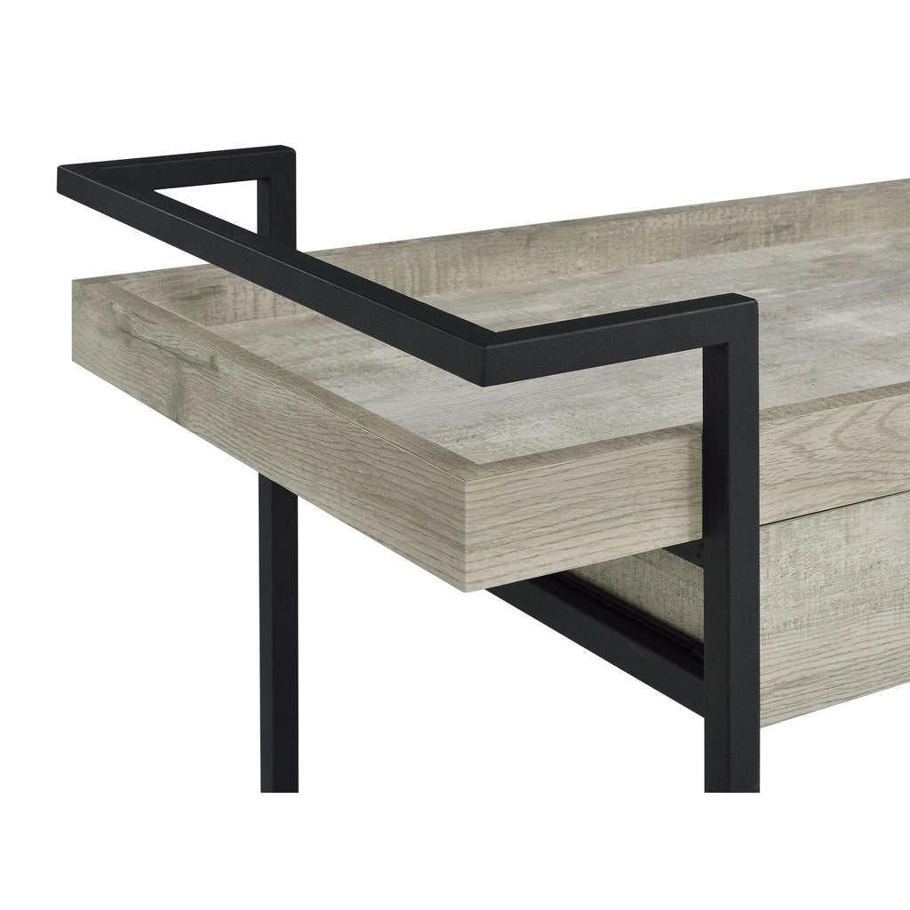 Speakeasy charm meets modern farmhouse in a delightful mobile bar cart. Whether you're mixing cocktails or pouring a favorite vintage, the cart offers plenty of space for both storage and prep with a tray-style top and shelf, plus a drawer ideal for accessories. A black finish metal frame includes handles, with three open squares on one side that help to keep bottles upright. A casual gray wood grain finish accents the look with farmhouse inspirations, perfect for relaxed living and dining rooms. Ball bearing drawer glides and caster wheels complete the cart with smooth, seamless performance.