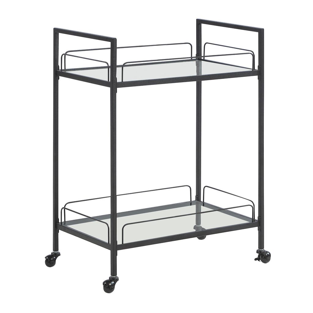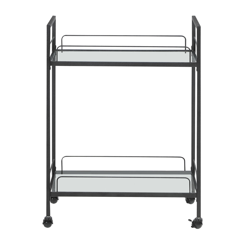 Minimal, clean lines create a versatile and sleek aesthetic to this contemporary serving cart. Built with a slim metal frame in a black hammer tone powder coated finish with caster wheels, this serving cart welcomes glassware, accessories and snacks to be smoothly transported to an entertaining area for guests and visitors. Stacked clear tempered glass shelves showcase stemware and favorite vintages to guests for their personal selection. With raised edges, you can rest easy knowing everything stays in place safely. Glide this serving cart into your living room for small get-togethers or keep it in a compact apartment as a multifunctional bar cart.